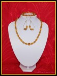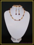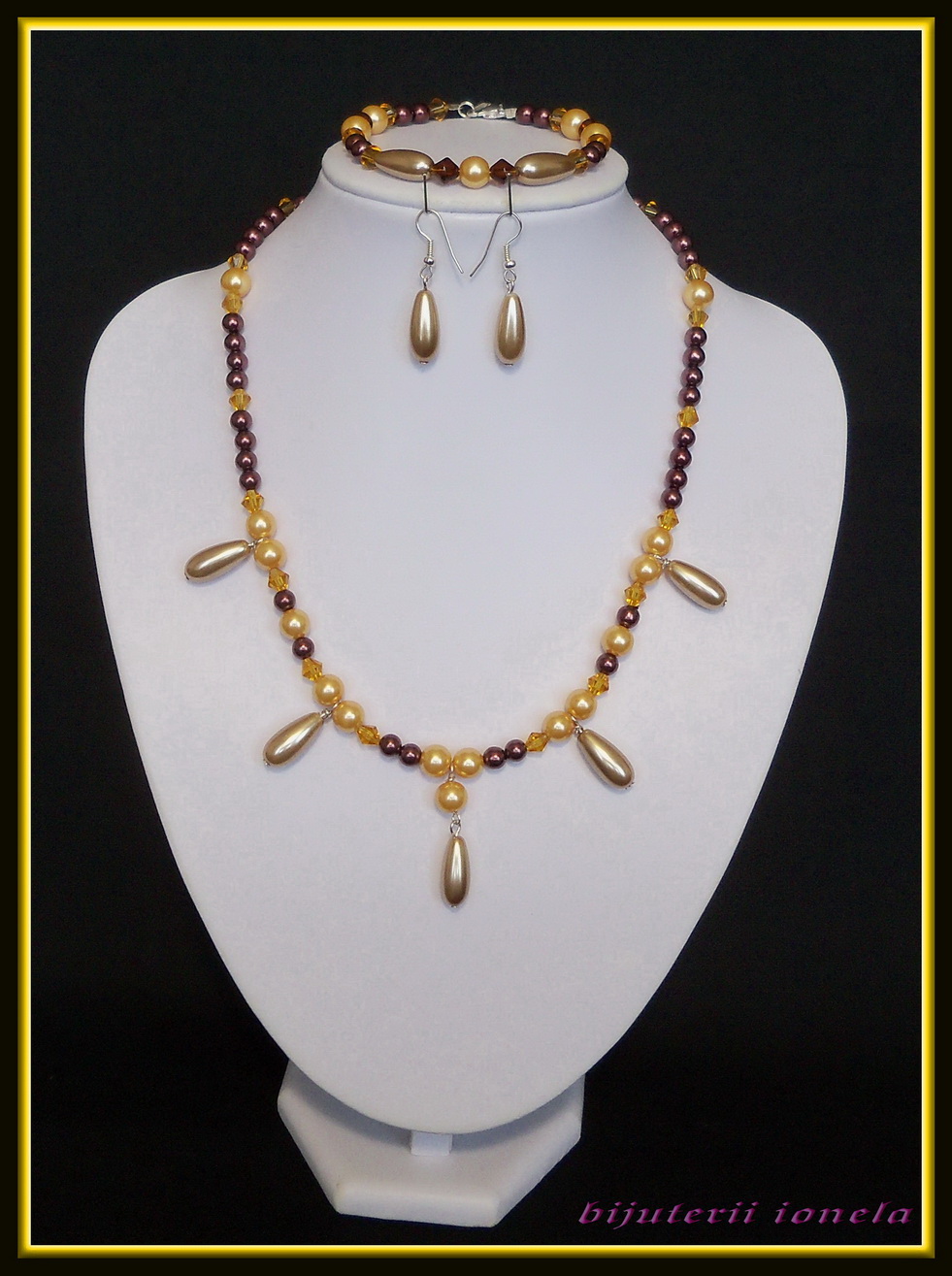 set-colier,cercei si bratara format din perle de sticla galbene,maron si aurii,biconice aurii 6 mm si accesorii argintii.