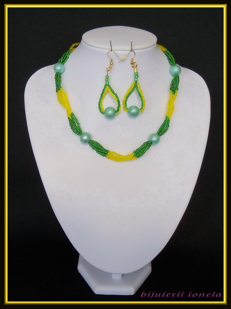 colier si cercei verde/galben.Colierul este multisir din margele de nisip verzi combinate cu galben , perle crapy si accesorii metalice aurii.