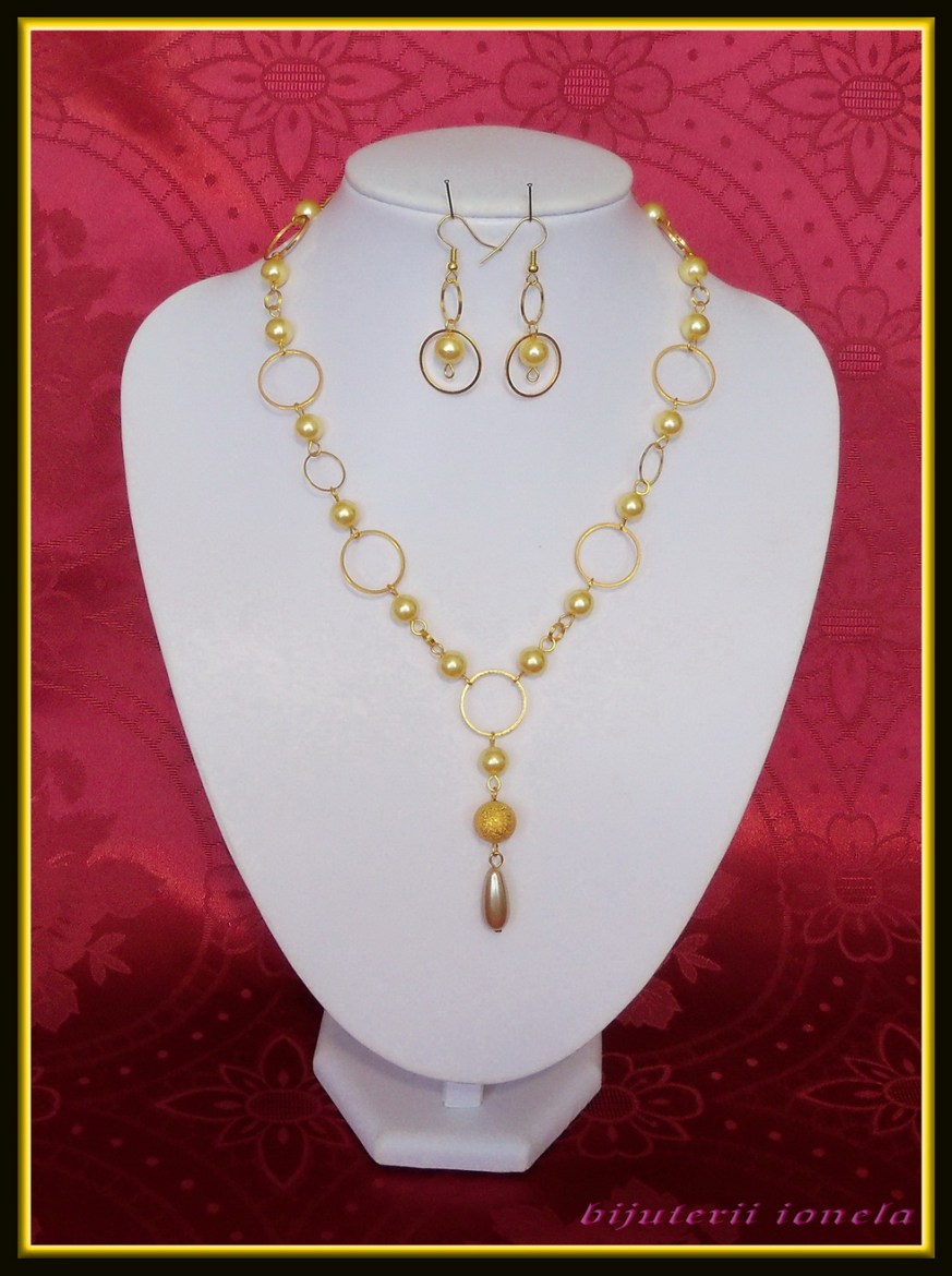 Colier si cercei din perle de sticla galbene, Perle Lacrima si accesorii metalice aurii.