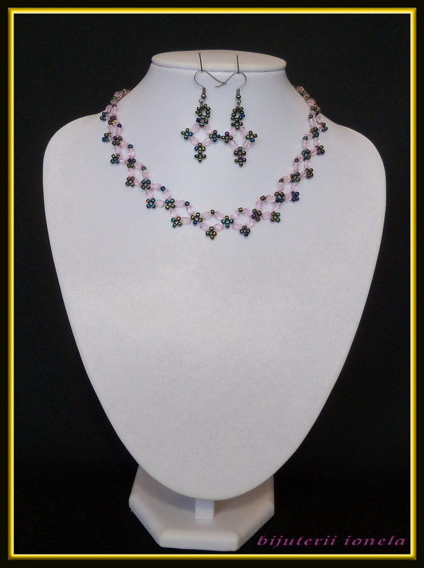Colier si cercei Format din margele de nisip culoare irizanta (Paun) de 3 mm si cristale bob de orez roz.La comanda se poate confectiona si bratara.