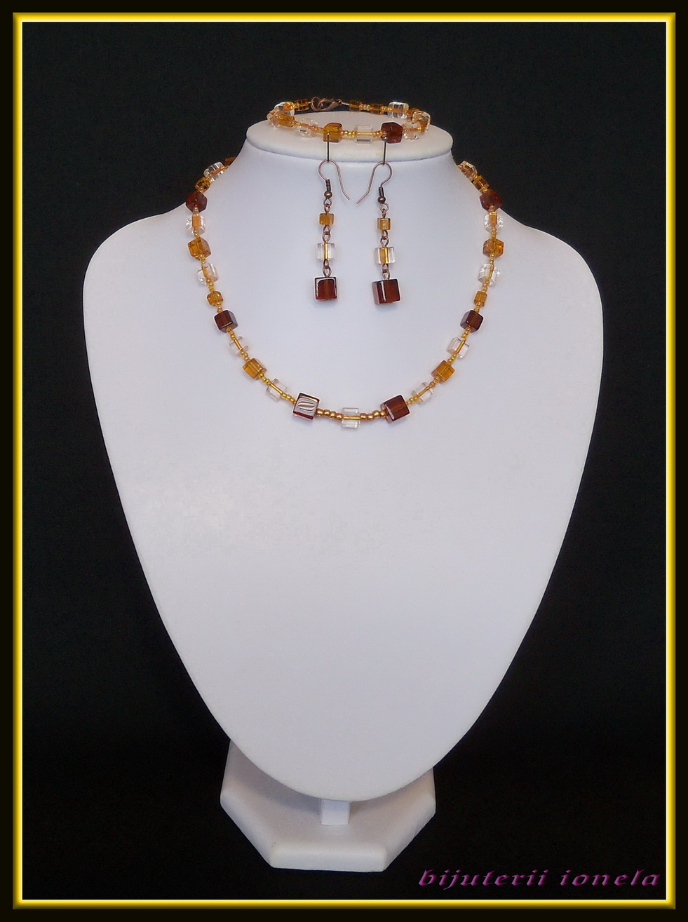 set din colier cercei bratara in combinatie maro si auriu din bead seed si margele cubice de la 4-8 mm