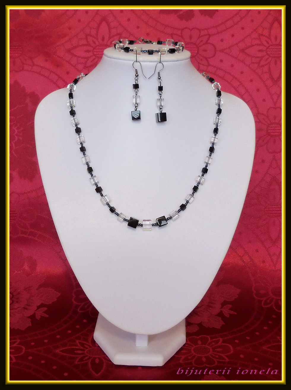 Cea mai veche combinatie de culorialb si negru,intotdeauna este la moda.Setul cuprinde margele sub forma de cub din sticla presata de 4-8 mm si bead seed de 2mm.