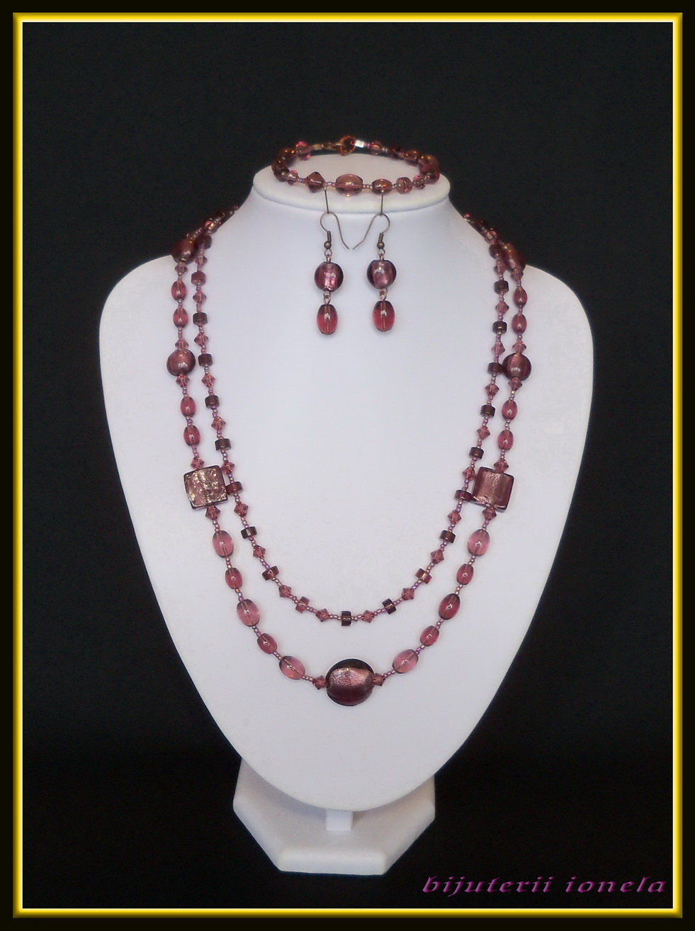Un set elegant format din colier in doua randuri sin margele de murano de marimi diferite,alaturi de margele din sticla presata de diverse forme si marimi,pe accesorii argintii.Setul are culoarea ametistului.