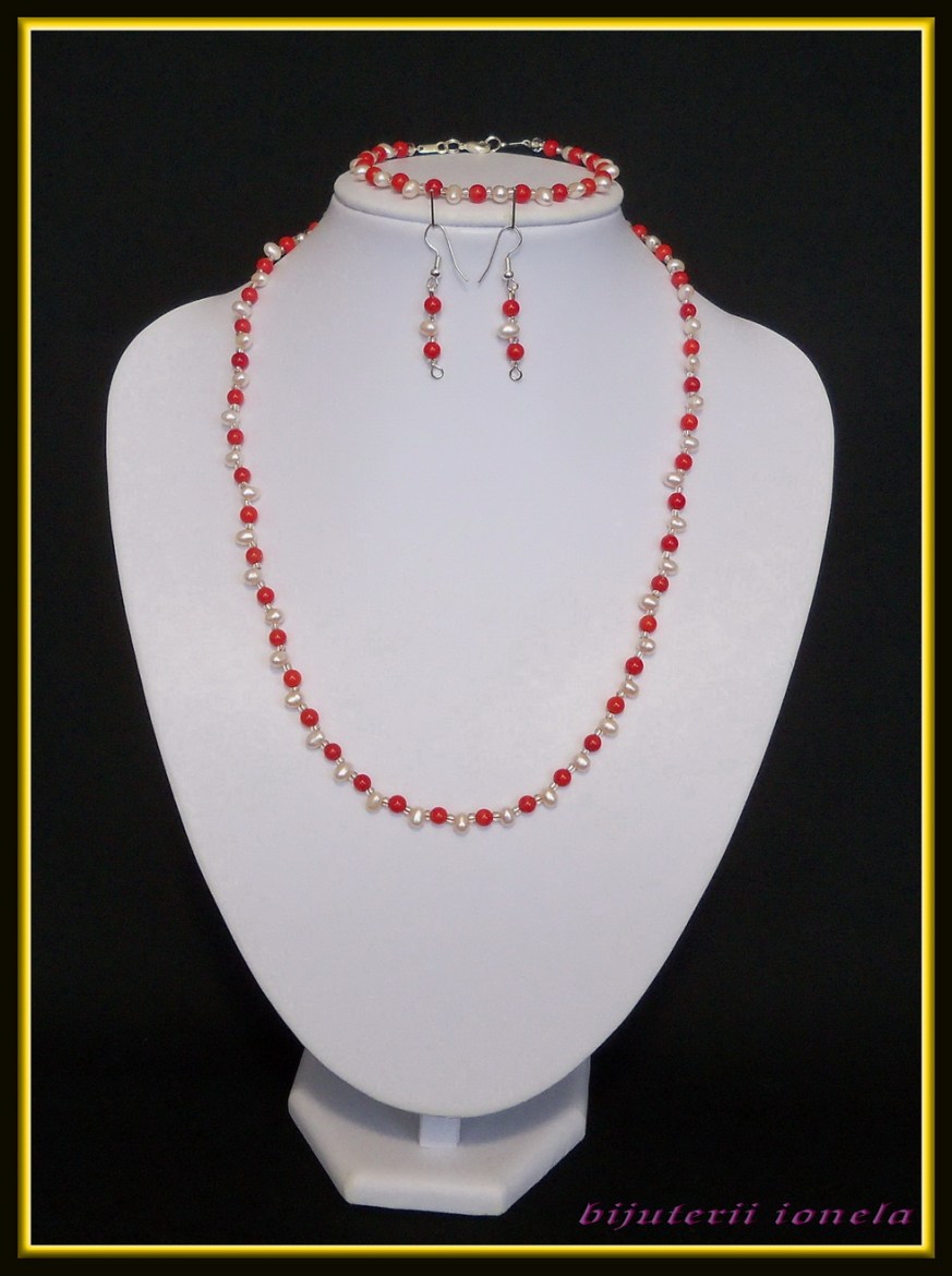 Un set finut compus din perlute naturale albe de 4-5 mm si coral sferic de 4mm ,pe accesorii argintii.