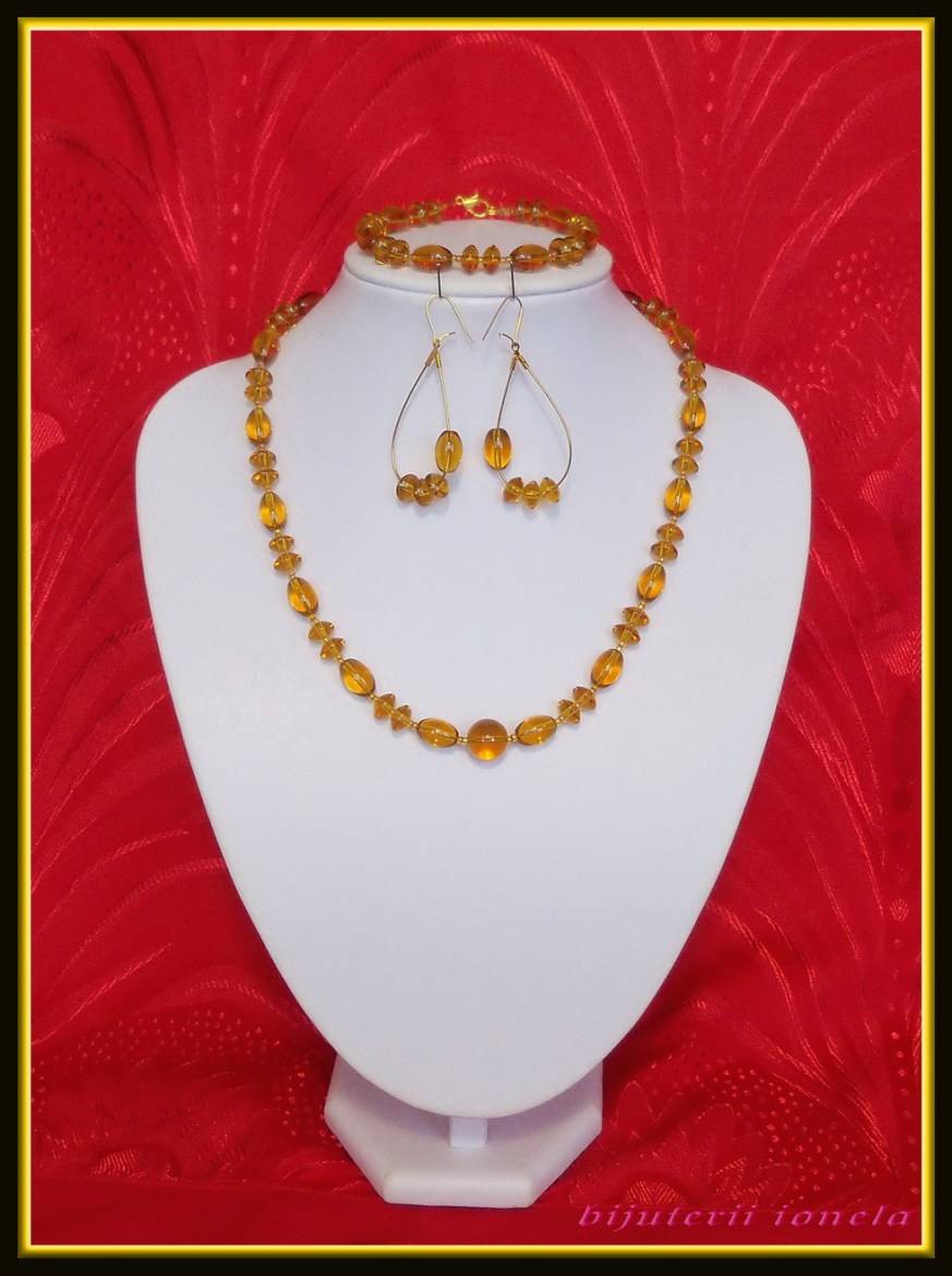 Set format din colier bratara si cercei din margele sticla presata de culoarea coniacului pe accesorii aurii.