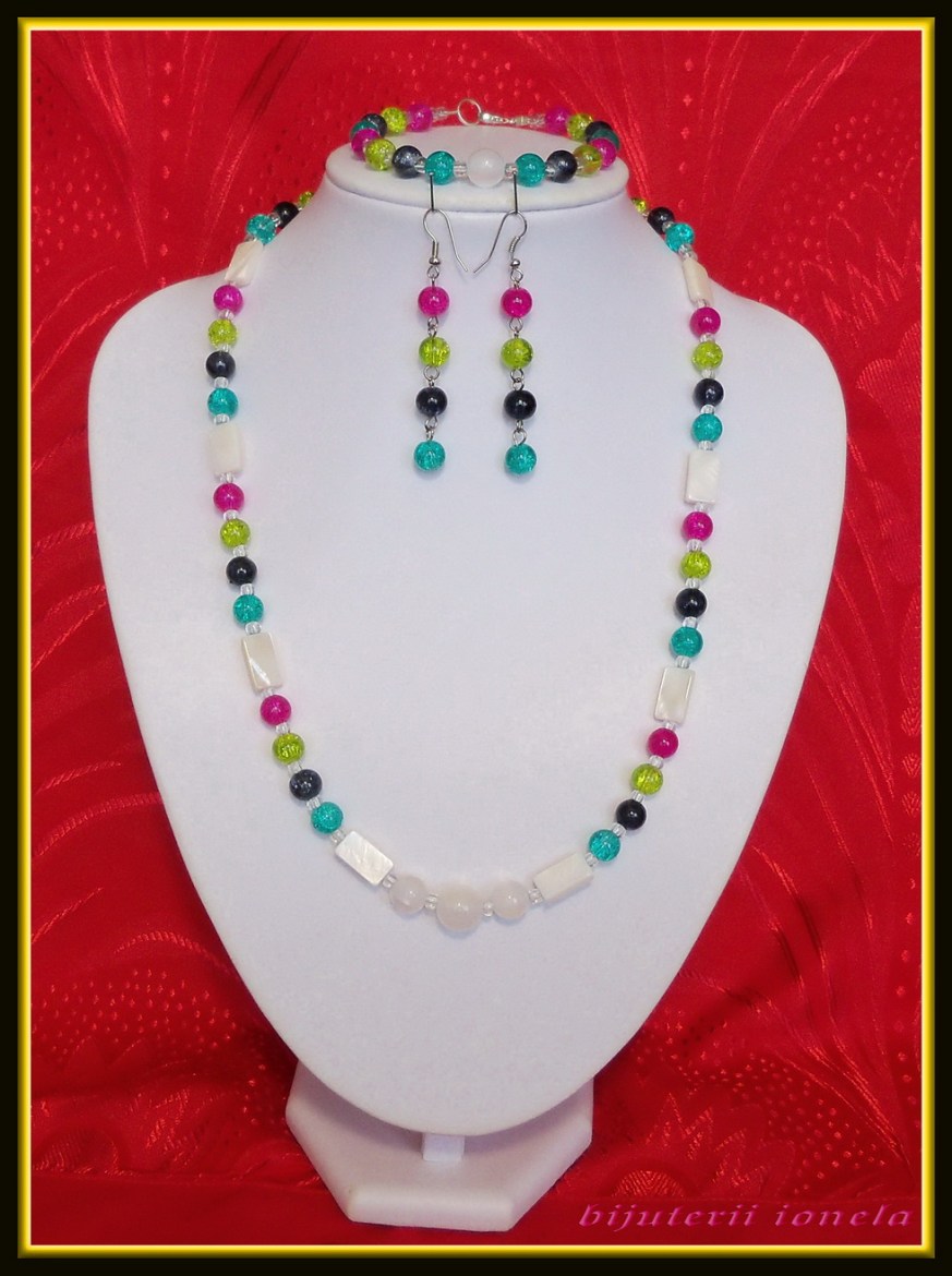set format din colier,cercei si bratara multicolor din margele crack de 6-8 mm si sidef alb.