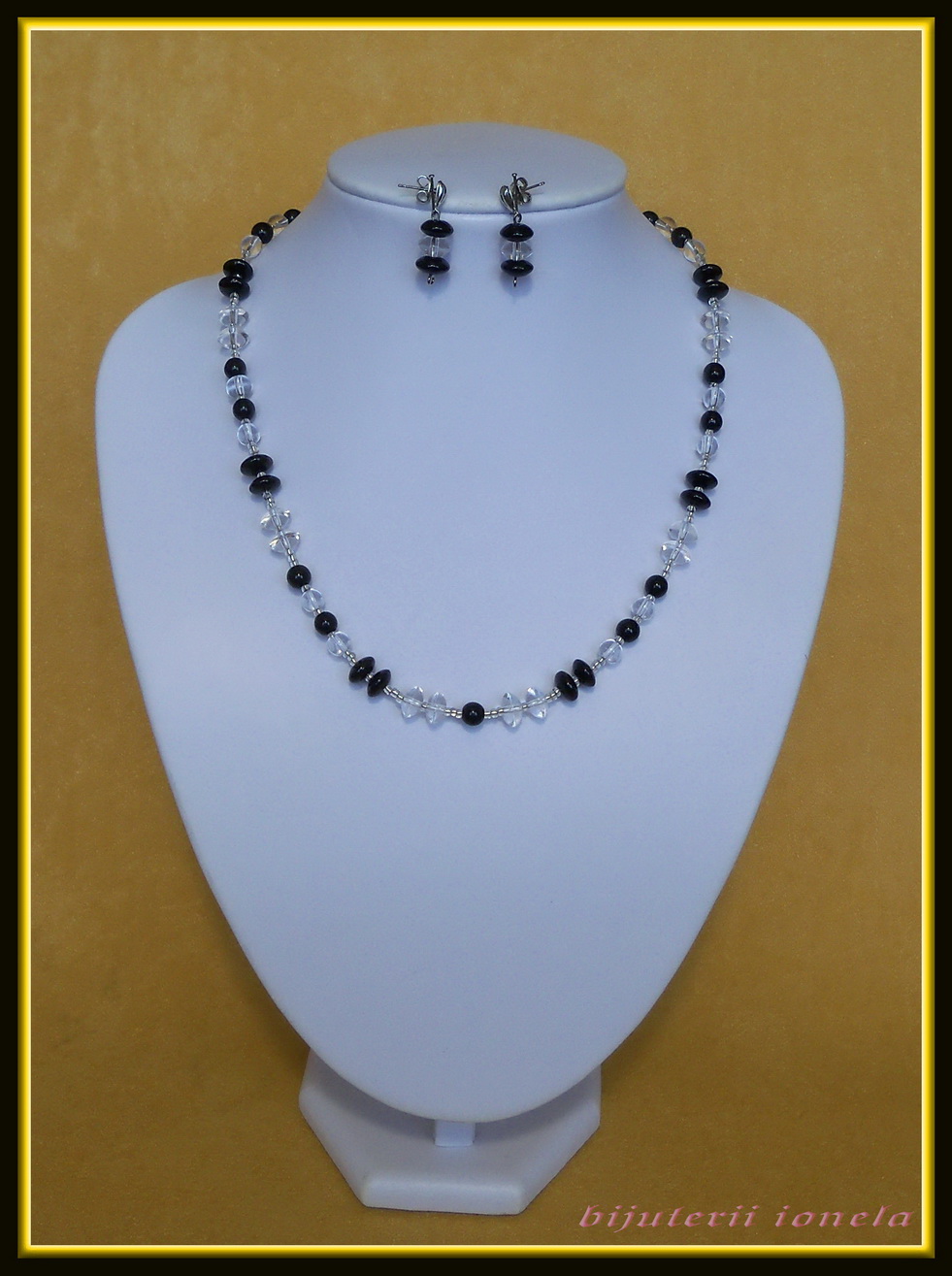 Set colier si cercei facut din bead seed albe de 2mm si discuri de sticla presata albe si negre si margele rotunde de 4mm.