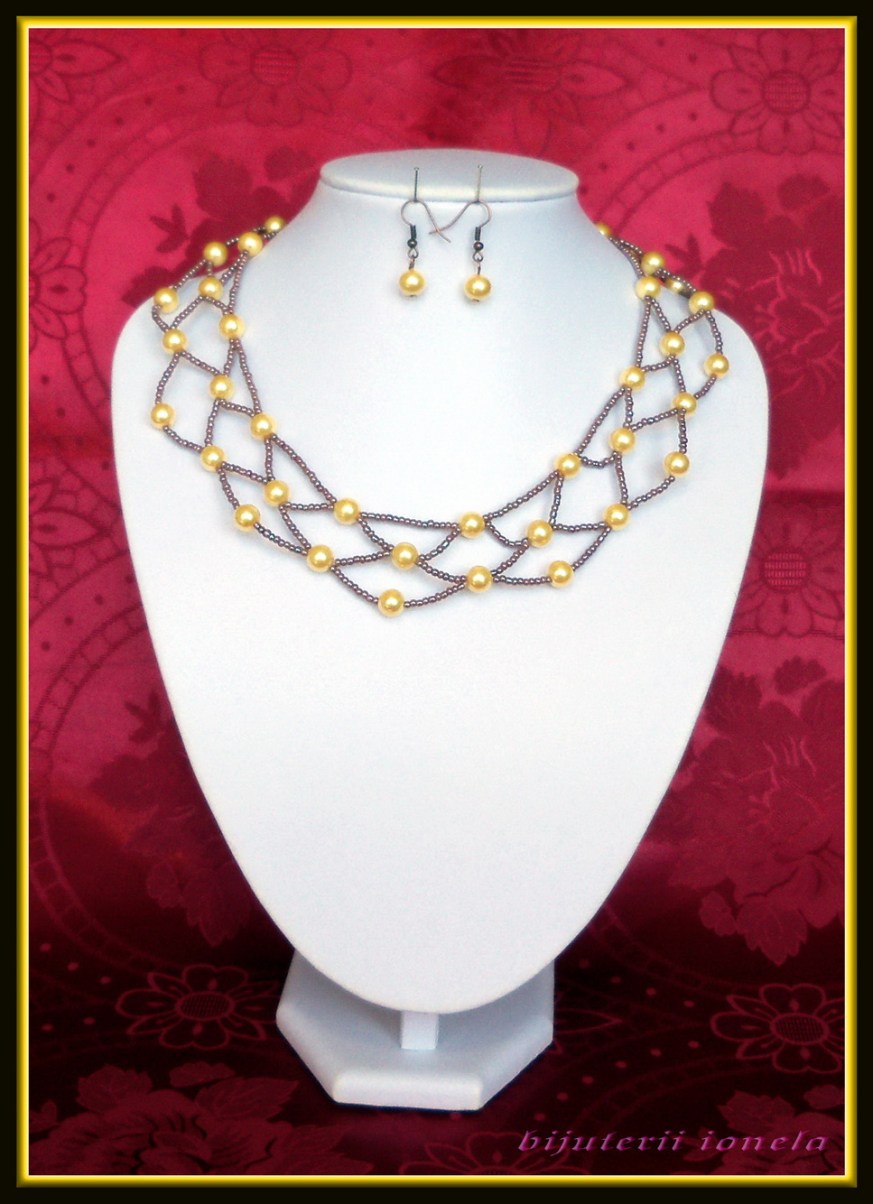 Set colier si cercei din bead seed 2mm maro si perle sticla 8 mm galbene.