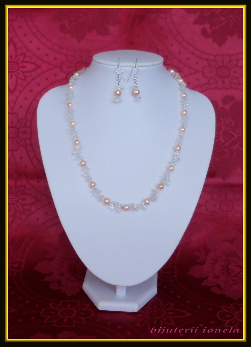 Set compus DIN colier si cercei lucrat NATURALE DIN perle de culoarea piersicii si cipsuri DIN Cristal de stanca (Vezi informatiile Despre Cristal de stanca de la pisica.. Pietre semipretioase)