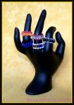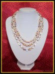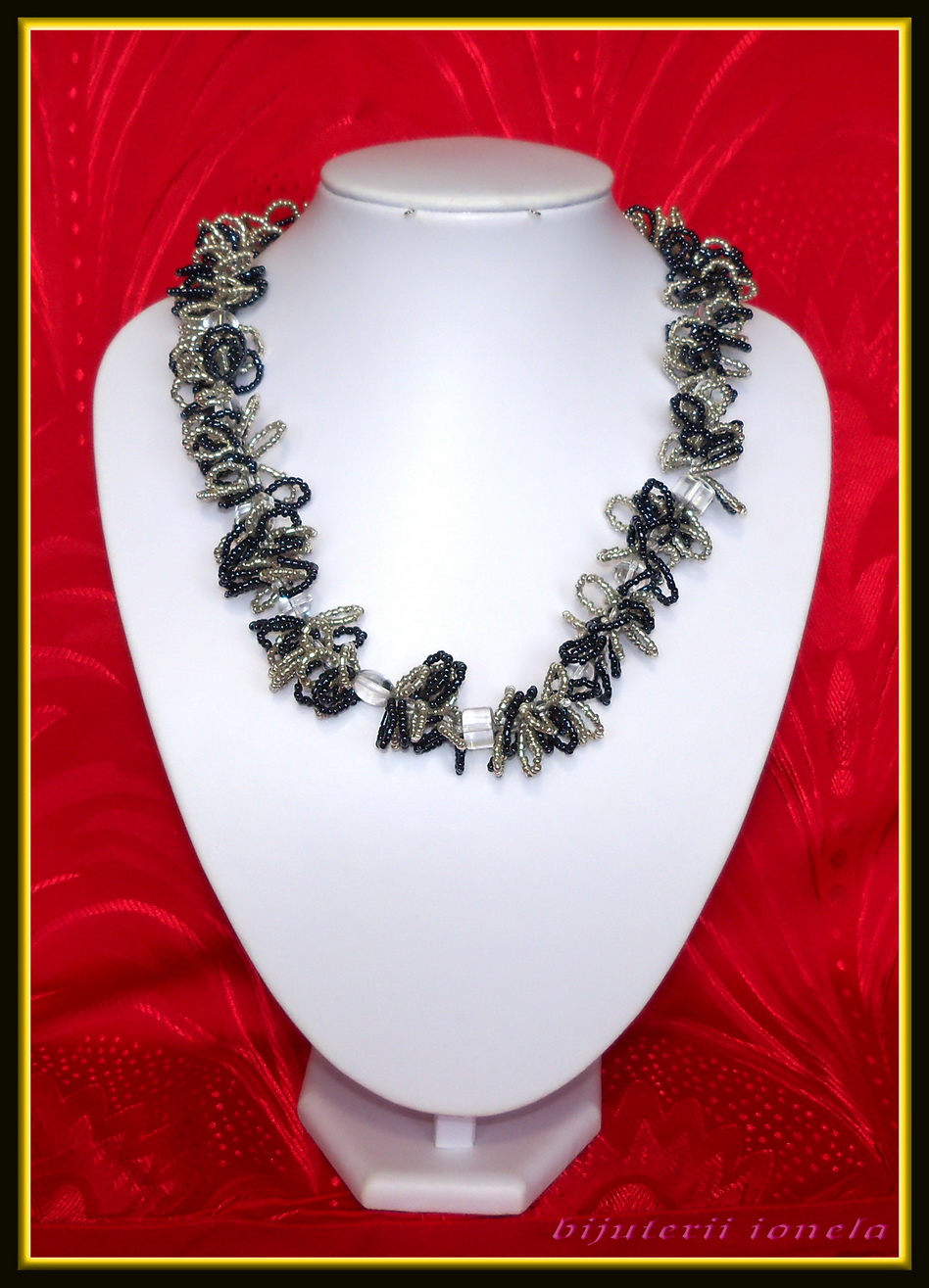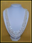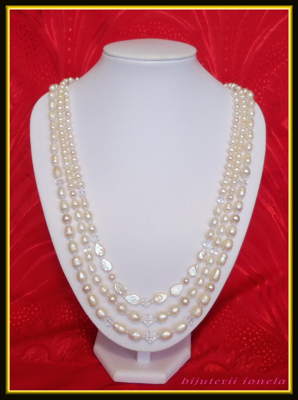 Colier in trei randuri care este compus din perle de cultura albe, de dimensiuni cuprinse intre 5-12 mm cu forme diferite de bob orez,rotunde ,”cartof” si lacrima,intercalate cu cristale albe transparente.Accesoriile sunt argintii.Un colier elegant care se poate purta la o tinuta deosebita.