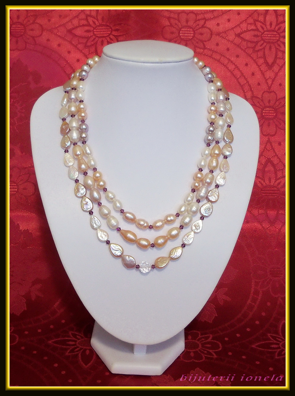 Colierul C9, Este un Piesa Centrala colectiei mele.Este colier un în trei randuri format din perle naturale în diferite nuante si mai ales în forme si marimi diferite de la 5 pina la 12 mm.De asemenea Mai cuprinde Cristale Swarovski (biconice de 4mm), Aurie Este inchizatoarea placata.Fiind un colier în trei randuri poate fi catalogat printesa colier Intre ONU matine SI.