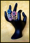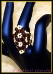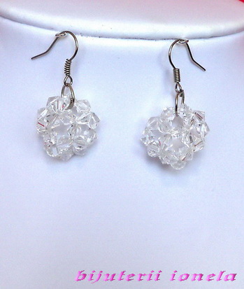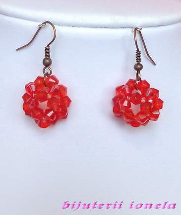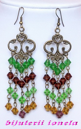 Cercei interesanti foarte lungi,aproximativ 10 cm, din biconice 5-6 mm de culoare topaz,maro,doua nuante de verde.Accesoriile sunt metalice de culoarea cuprului patinat,iar candelabru sub forma de inima.