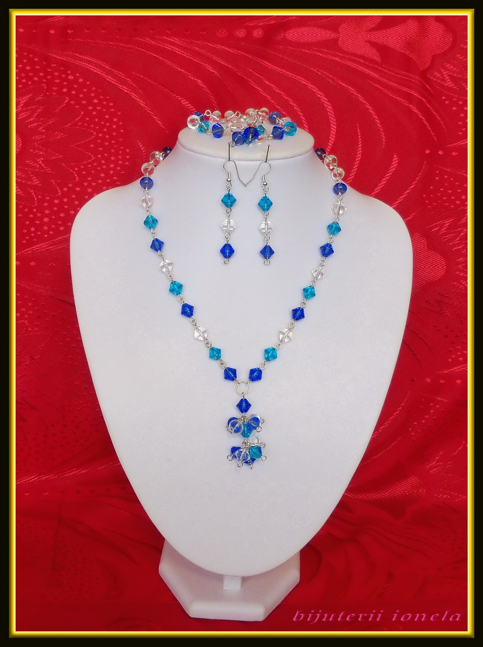 Set din colier,bratara,cercei format din margele rotunde si biconice,albe si nuante de albastru.
