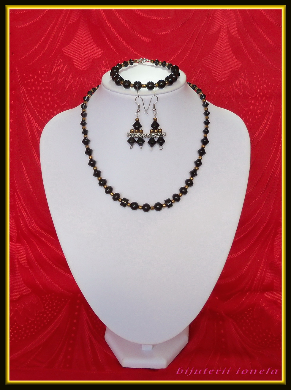 set din colier,bratara,cercei negru/auriu facut din margele rotunde si biconice negre de diferite marimi.Accesorii metalice de culoarea nichelului.