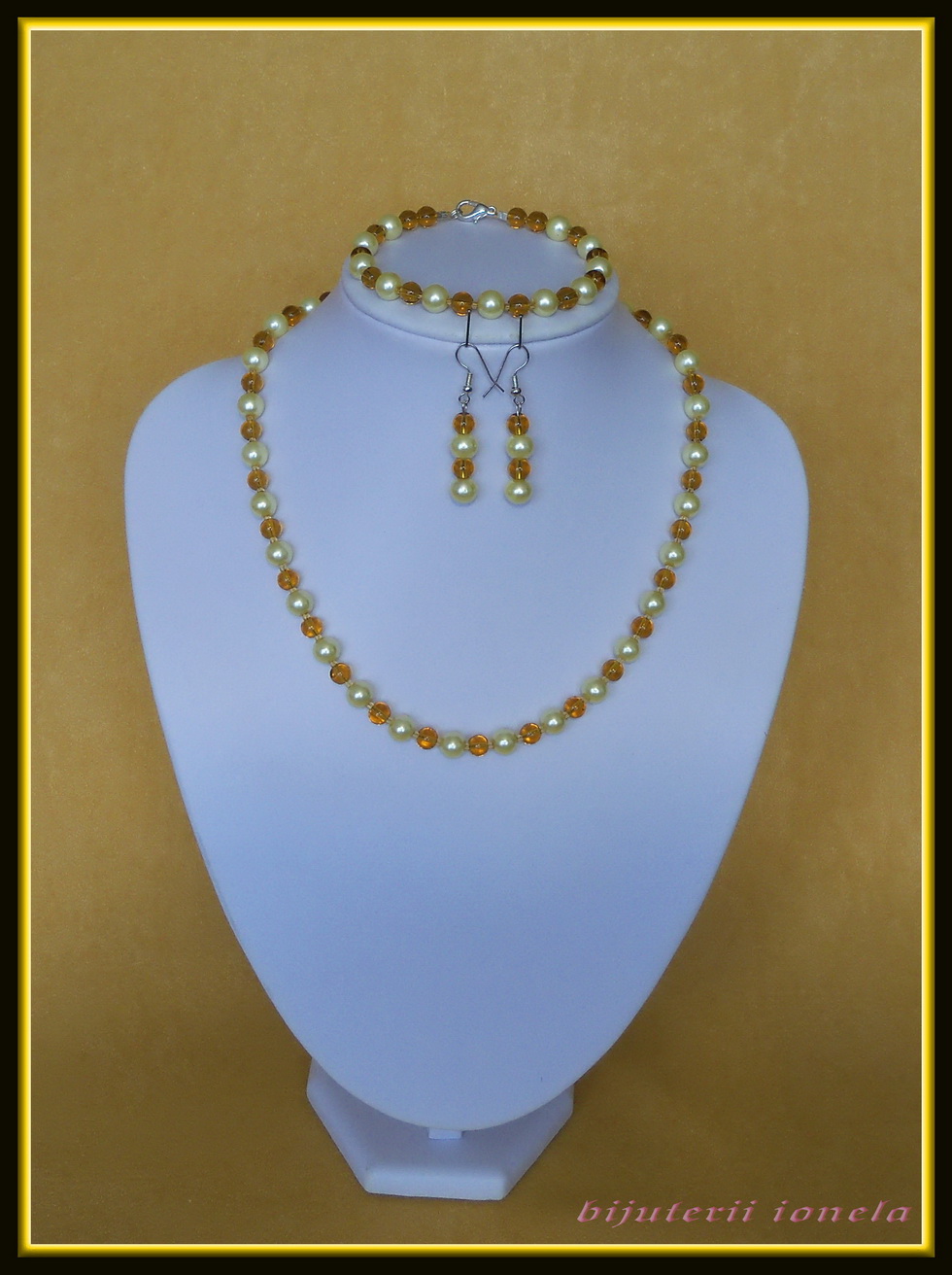 Set colier, bratara si cercei din perle de sticla rotunde de 6 mm, de culoare galbena, si margele rotunde din sticla presata de 6 mm, culoarea coniacului.Accesorii metalice argintii.