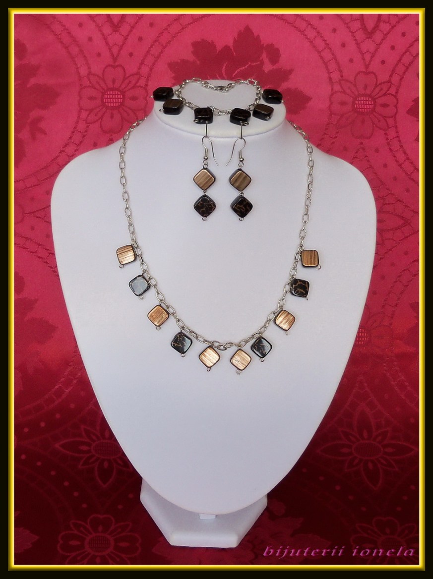 Set compus din colier,bratara si cercei.Setul este din margele acrilice patrate de culoare maro/negru asezate pe lant de culoarea nichelului.