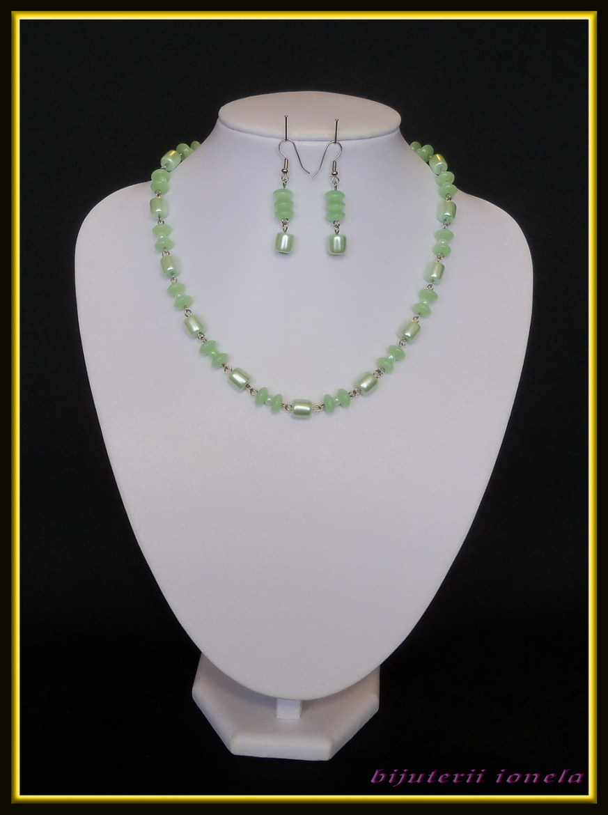 Set colier si cercei alb /verde format din margele disc si margele cilindrice.Colierul are 46 cm,iar cerceii 4 cm.Accesorii metalice argintiu inchis.