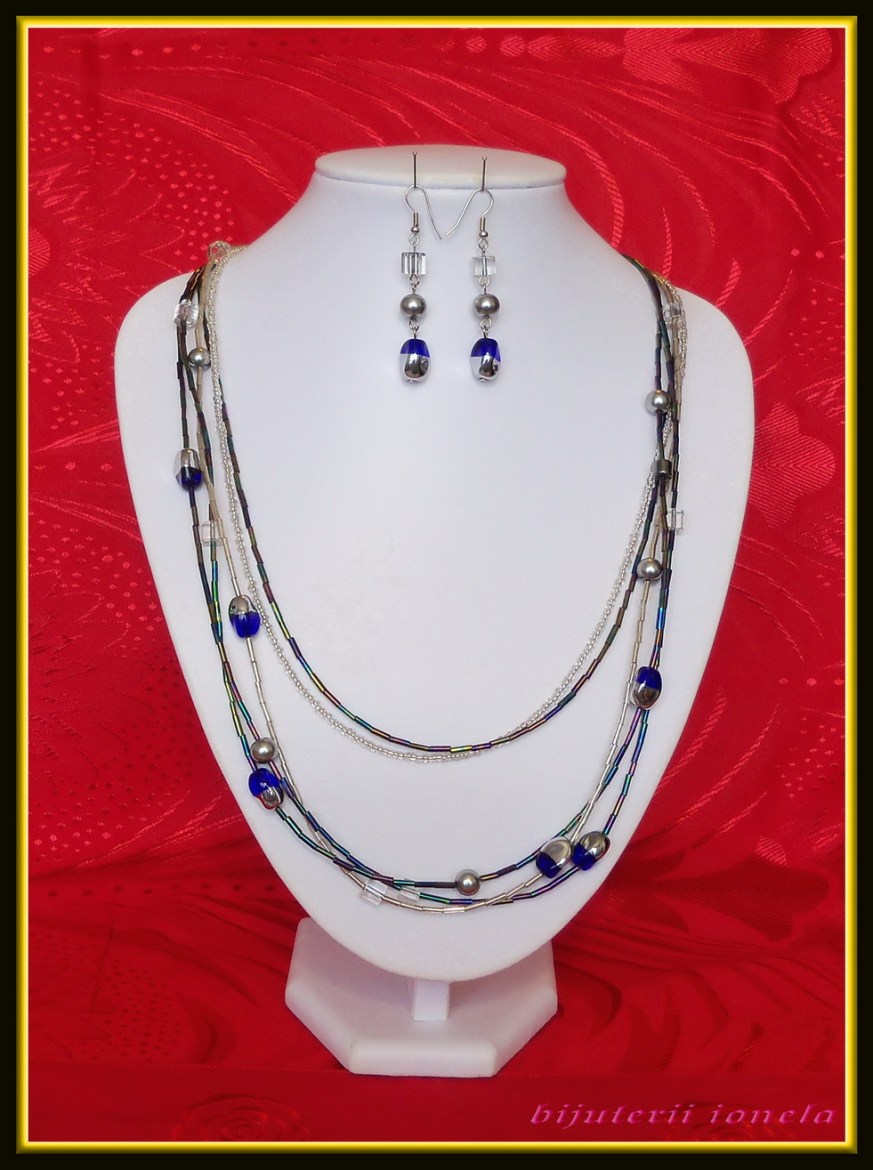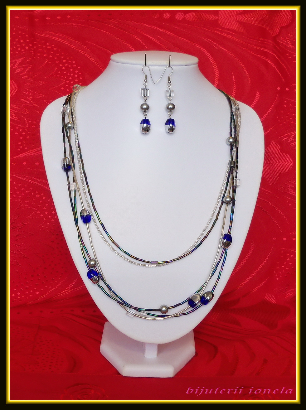 Set din colier si cercei.Colierul este format din doua randuri,care sunt: cel scurt de aprox.60 cm are doua randuri si cel de-al doilea are trei randuri si este de aprox.70 cm.Contine margele tubulare,cuburi de sticla presata 6 mm,perle de sticla gri de 8 mm si cristal „italian style” in doua culori argintiu si albastru cobalt.Cerceii au 6 cm.