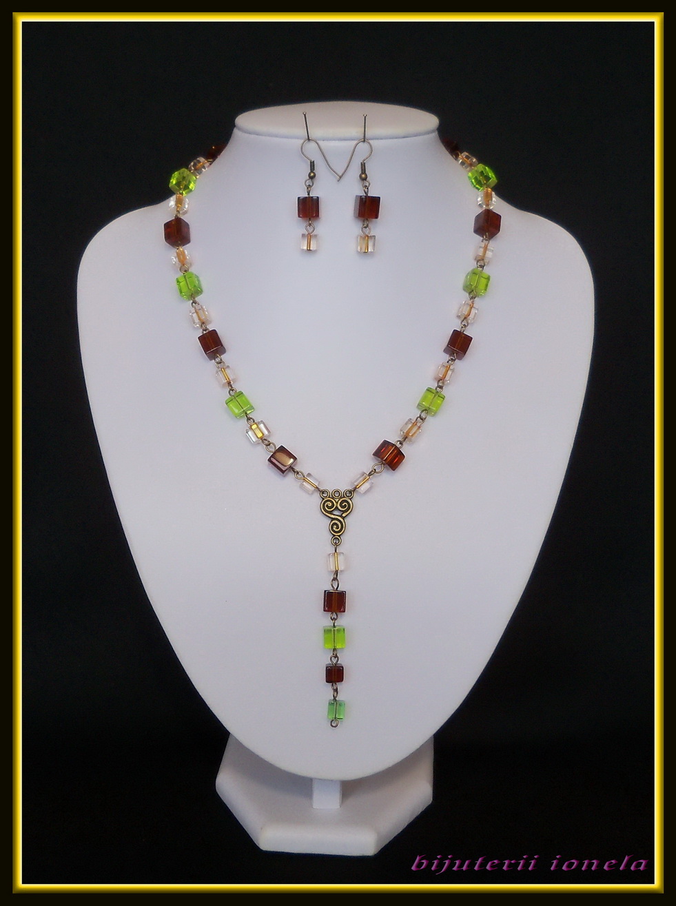 Set din colier si cercei format din cuburi de sticla presata,de 6 si 8 mm ,maro,verde si transparente cu strasuri aurii.Colierul are 47 cm,iar in centru un accesoriu metalic bronz patinat care prelungeste colierul cu inca 8 cm.Cerceii au o lungime de 4 cm.