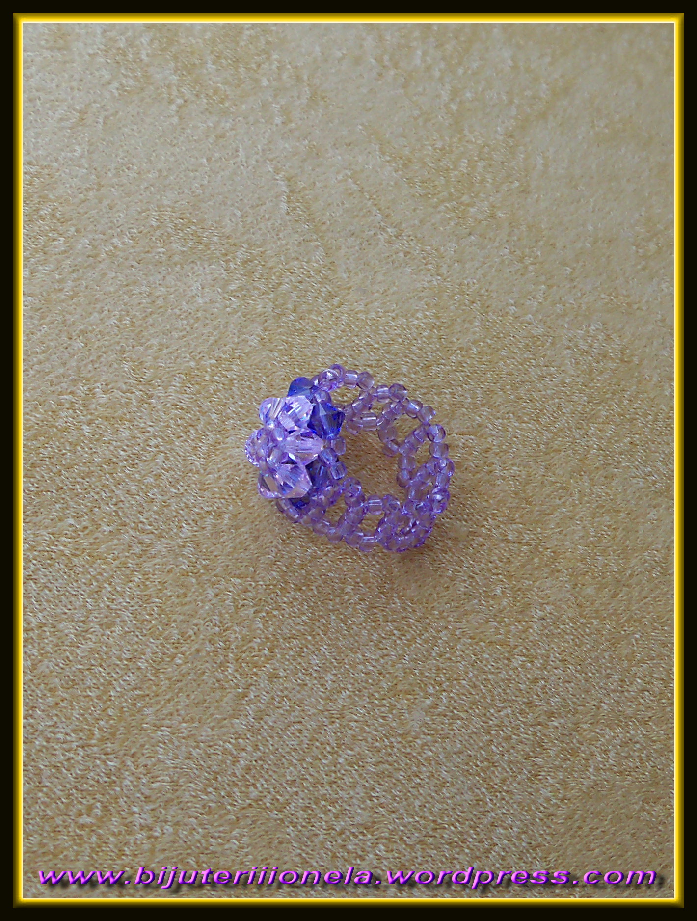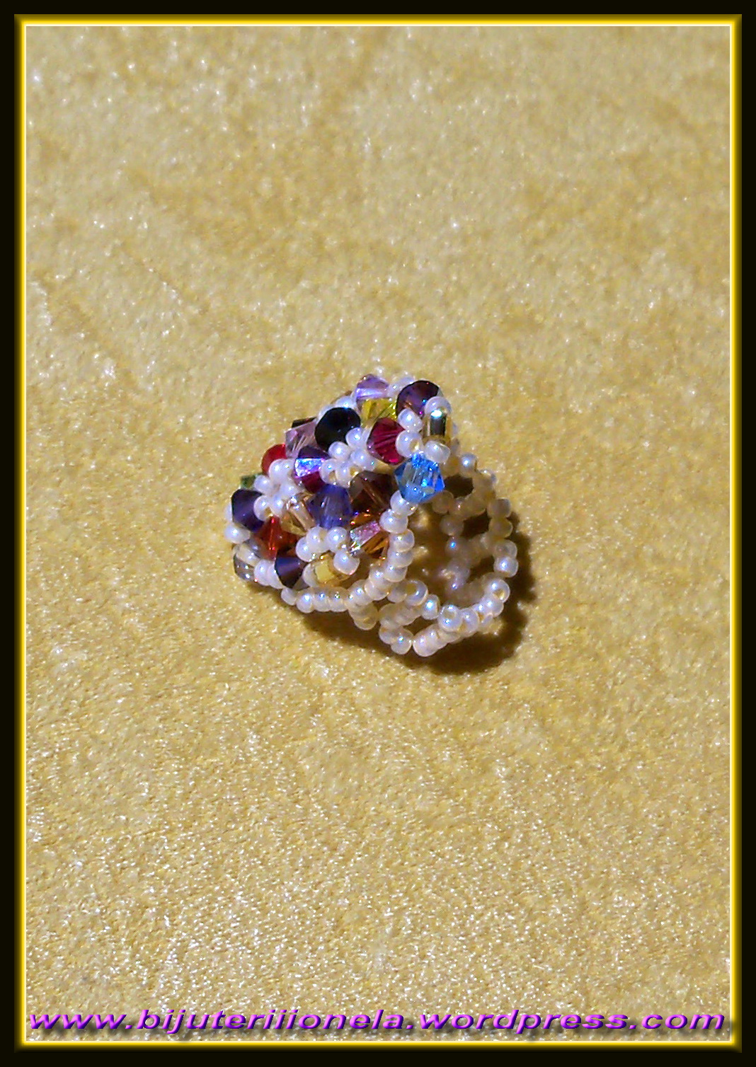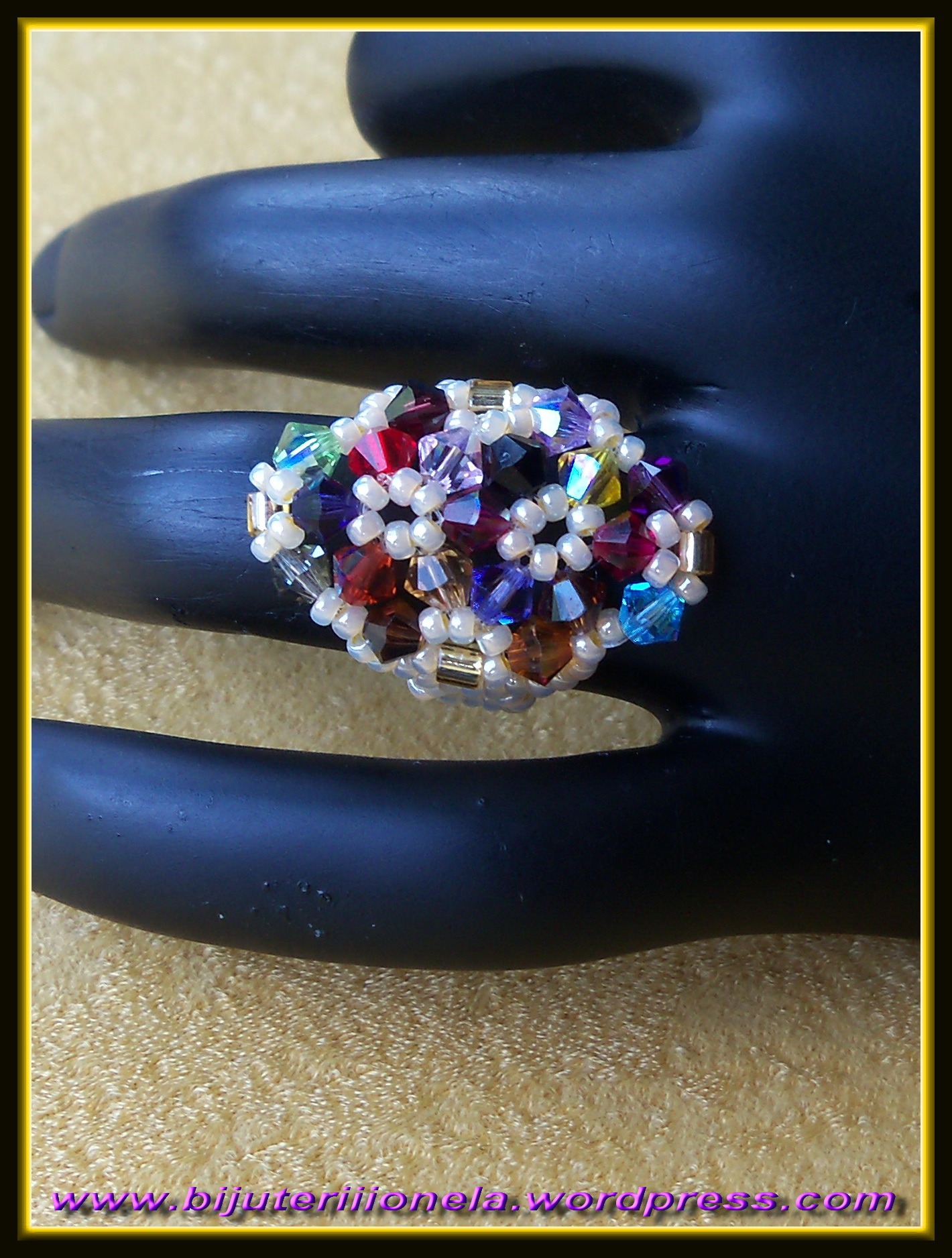 Inele confectionate din cristale Swarovski biconice de 4 mm ,in combinatii de culori diferite,margele toho 11/0 si fir de nylon.Un model deosebit ce cuprinde aproximativ 20 cristale si ,care se poate face in marimea dorita.