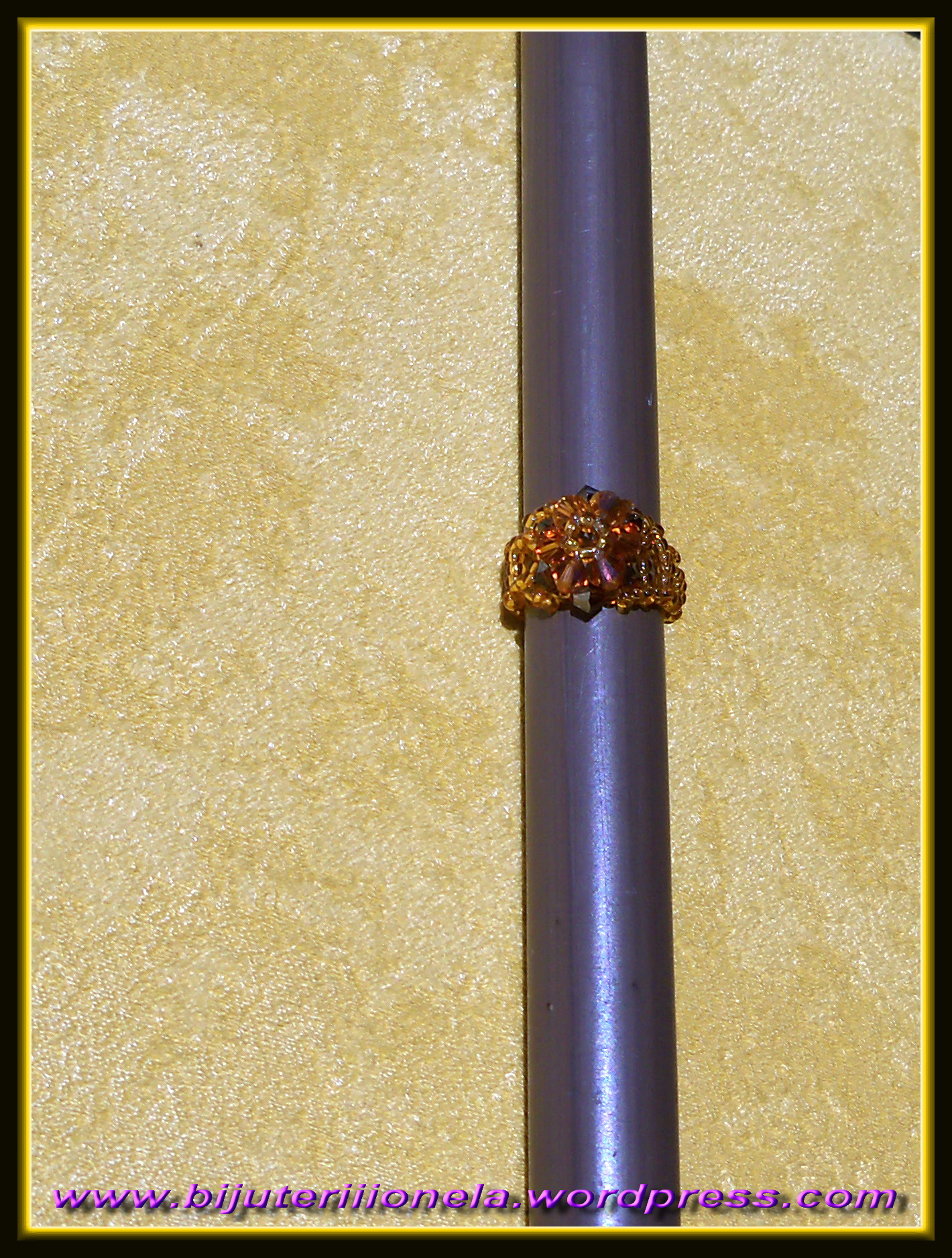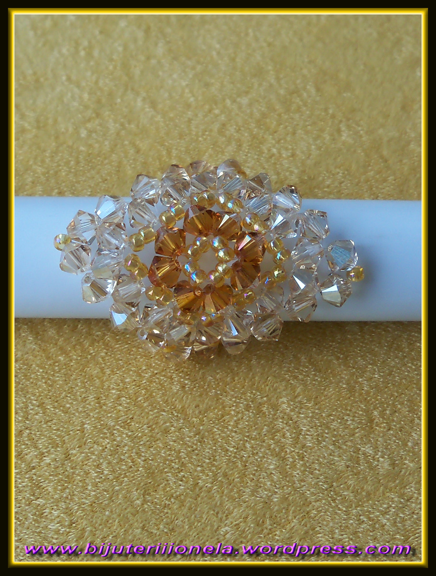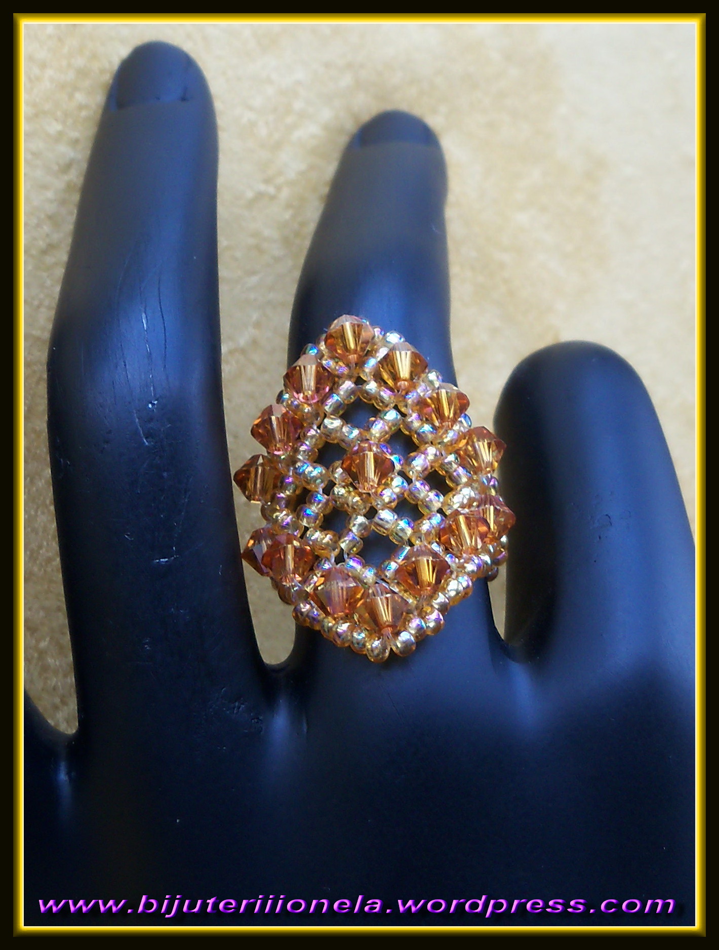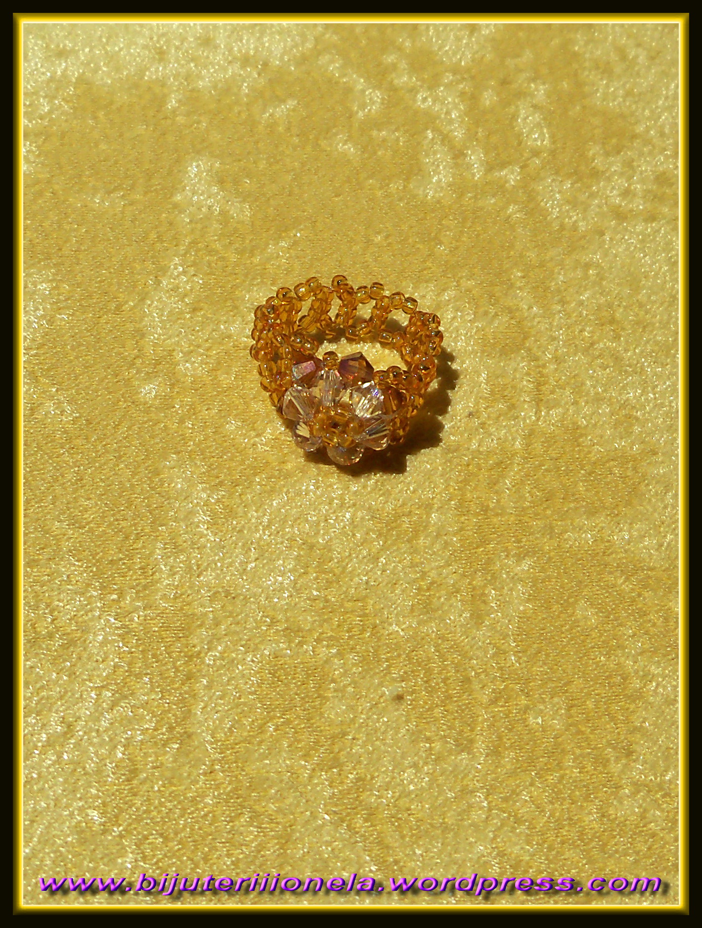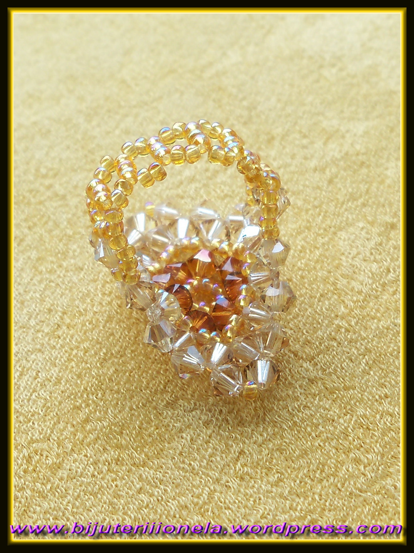 Inel confectionat din cristale Swarovski biconice de 4 mm de culoare topazului si aurii cu efect AB (aurora boreala),margele toho, pe fir de nylon.Inelul cuprinde aprox 50 de cristale poate fi facut in marimea dorita.Este un model mare,elegant care arata foarte bine pe deget.