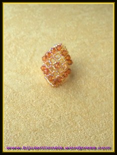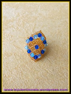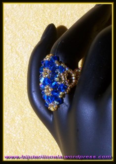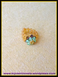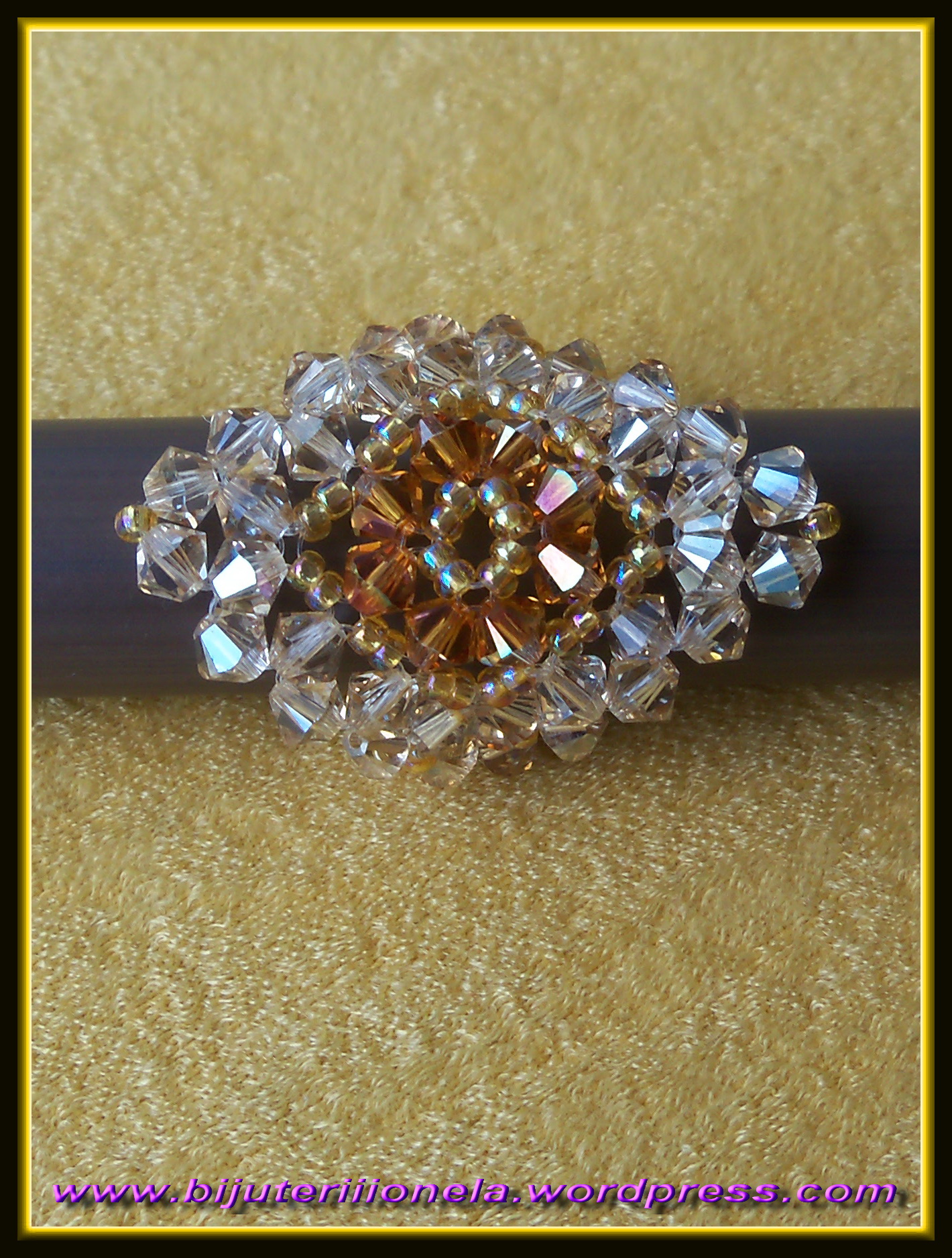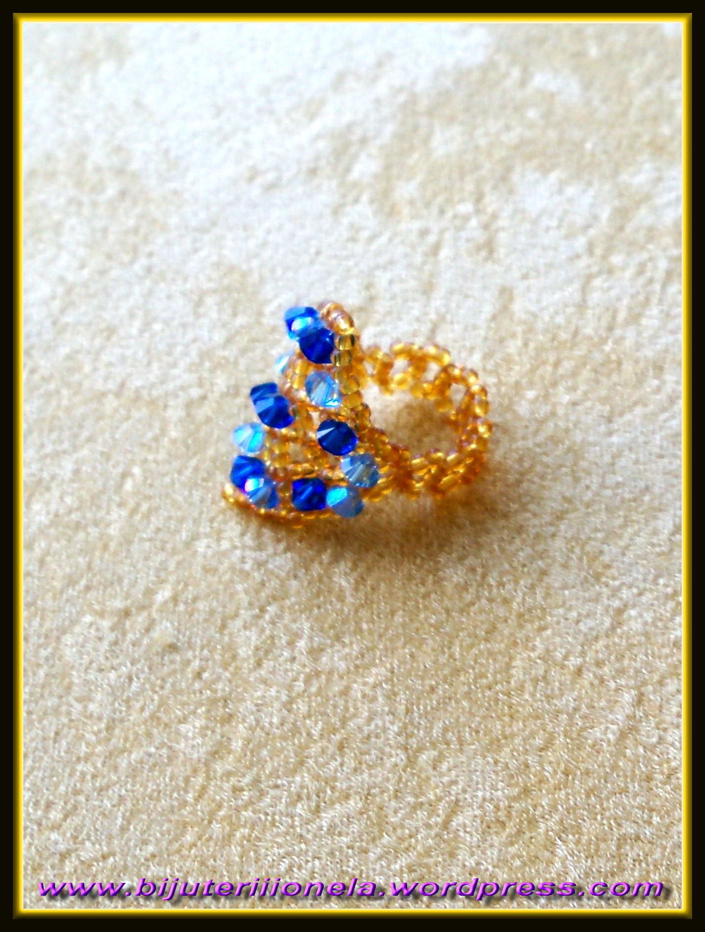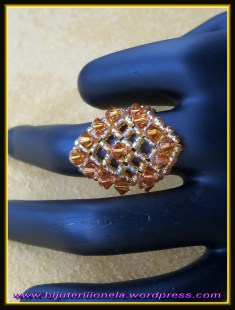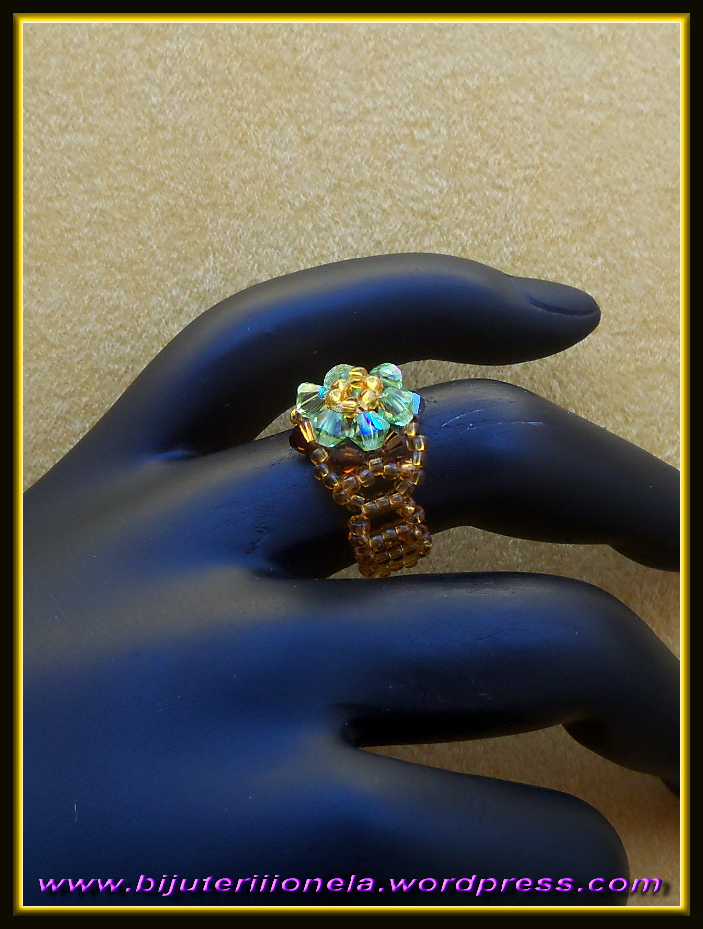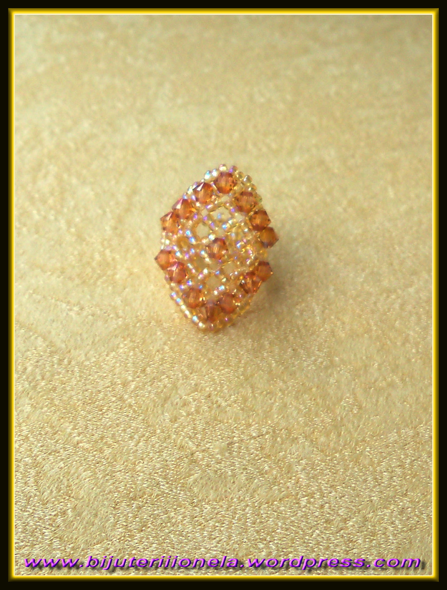 Inel confectionat din cristale Swarovski biconice de 4 mm de culoare topazului si aurii cu efect AB (aurora boreala),margele toho, pe fir de nylon.Inelul cuprinde aprox 50 de cristale poate fi facut in marimea dorita.Este un model mare,elegant care arata foarte bine pe deget.