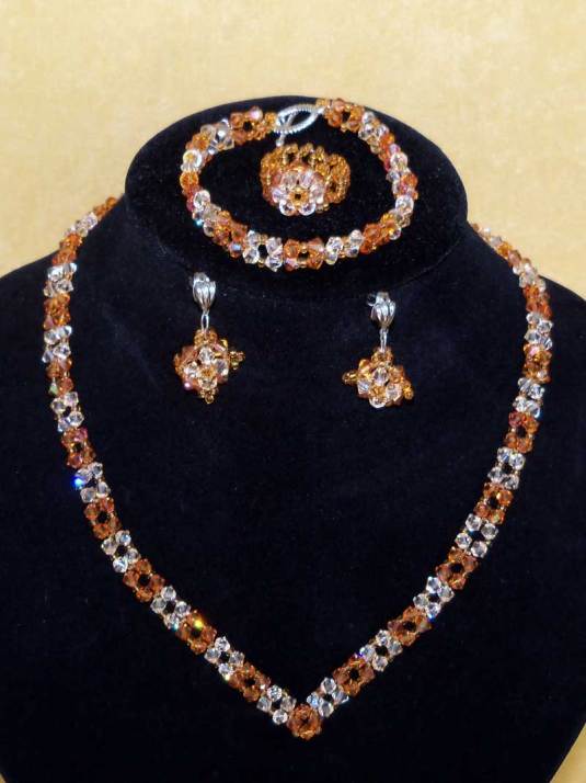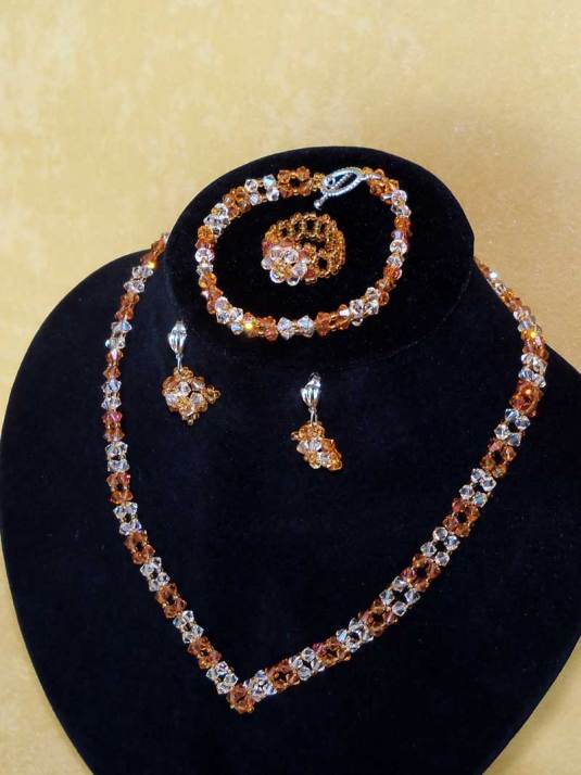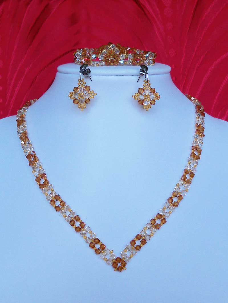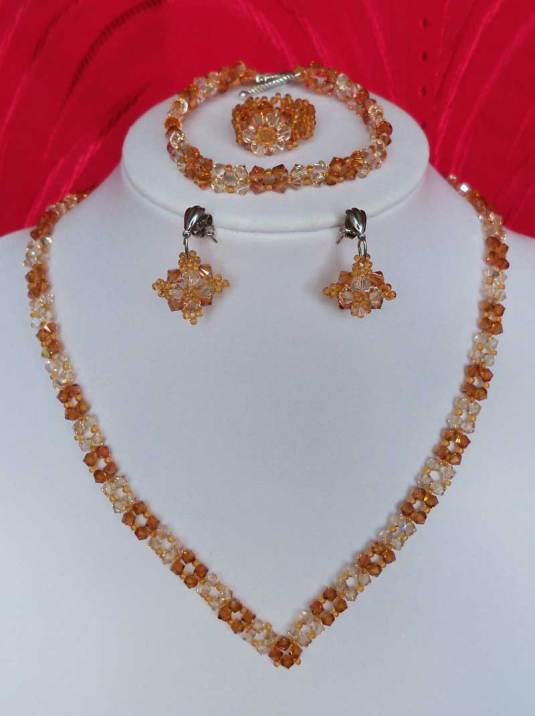 Un set complet,stralucitor facut din peste 280 cristale biconice Swarovski cu taietura xilion- „The best of brilliance!” ( nota : Taietura” xilion” este brevetata si inregistrata sub marca „CRYSTALLIZED TM – SWAROVSKI ELEMENTS” ,dau cristalelor cel mai inalt nivel de stralucire si intensitate a culorii si astfel, cristalele au stralucire de diamante! )Am folosit cristale biconice gold shadow de 4 mm ,impletite cu cristale biconice copper de 4 mm, ajustate cu margele toho 11/0 topaz ,insirate pe fir special monofilament de teflon ultra stong.Colierul este in V, la baza gatului ,avind inchizatoare lucrata manual din margele toho.Bratara are aprox.18-19 cm si are inchizatoare din argint tibetan.Cerceii scurti,au tortitele cu surub si sunt placate cu rodiu.De asemenea setul mai are si un inel asortat cu un diametru de 1,8 -1,9 cm.