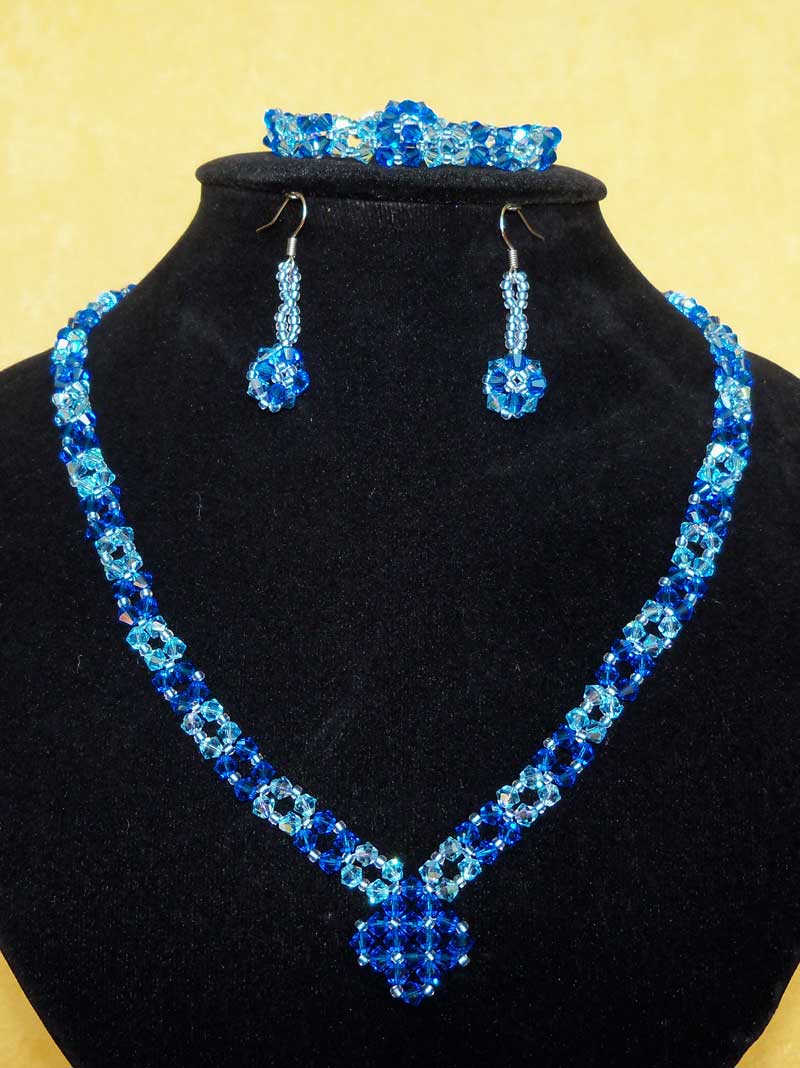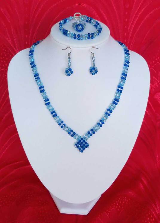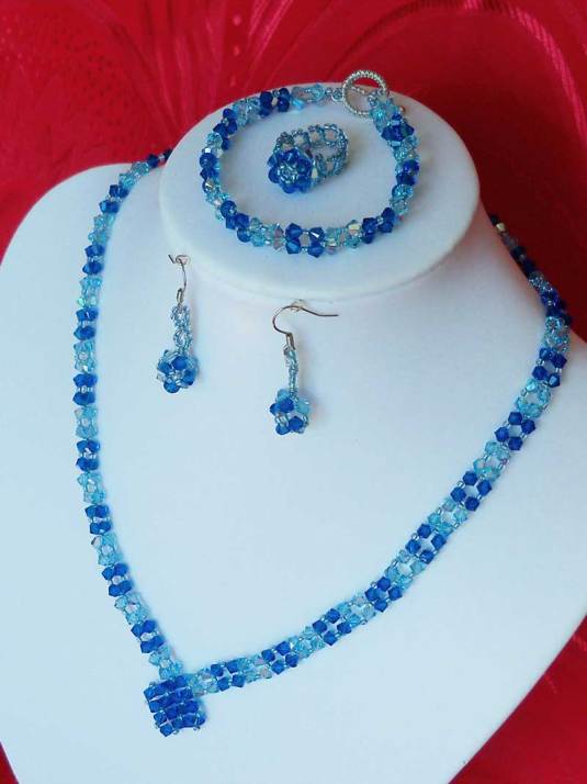 Setul „blue eyes” este compus din colier,cercei,bratara si inel.Este lucrat pe fir monofilament teflon,foarte rezistent si are in componenta cristale biconice Swarovski cu taietura xilion- „The best of brilliance!” ( nota : Taietura” xilion” este brevetata si inregistrata sub marca „CRYSTALLIZED TM – SWAROVSKI ELEMENTS” ,dau cristalelor cel mai inalt nivel de stralucire si intensitate a culorii si astfel, cristalele au stralucire de diamante! )Am folosit cristale biconice Swarovsky de 4 mm , crapy blue si saphire cu efect AB (aprox. 300 buc ) ,si margele toho 11/0, albastru saphire cu interior argintiu . Colierul este la baza gatului , si masoara aprox.43-45 cm , iar inchizatoarea este facuta din margele toho.Bratara are o lungime de aprox.18 cm, inchizatoarea este din argint tibetan de culoare gun metal.Cerceii au o lungime de 4cm ,inclusiv tortitele.Inelul are un diametru de 1,8 -1,9 cm dar se poate face si in alte marimi.