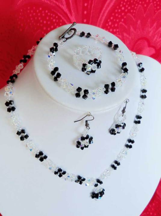 Un set elegant si stralucitor compus din colier,cercei,bratara si inel.Este lucrat pe fir de nylon rezistent si are in componenta cristale biconice Swarovski cu taietura xilion- „The best of brilliance!” ( nota : Taietura” xilion” este brevetata si inregistrata sub marca „CRYSTALLIZED TM – SWAROVSKI ELEMENTS” ,dau cristalelor cel mai inalt nivel de stralucire si intensitate a culorii si astfel, cristalele au stralucire de diamante! )Am folosit cristale biconice – Swarovsky de 4 mm , negre si albe cu efect AB (aprox. 230 buc ) ,si margele toho 11/0, alb- matase cu efect AB. Colierul este la baza gatului , si masoara aprox.43-45 cm , iar inchizatoarea este facuta din margele toho.Bratara are o lungime de aprox.18 cm, inchizatoarea este din argint tibetan de culoare gun metal.Cerceii au o lungime de 4cm ,inclusiv tortitele.Inelul are un diametru de 1,8 -1,9 cm dar se poate face si in alte marimi.