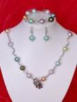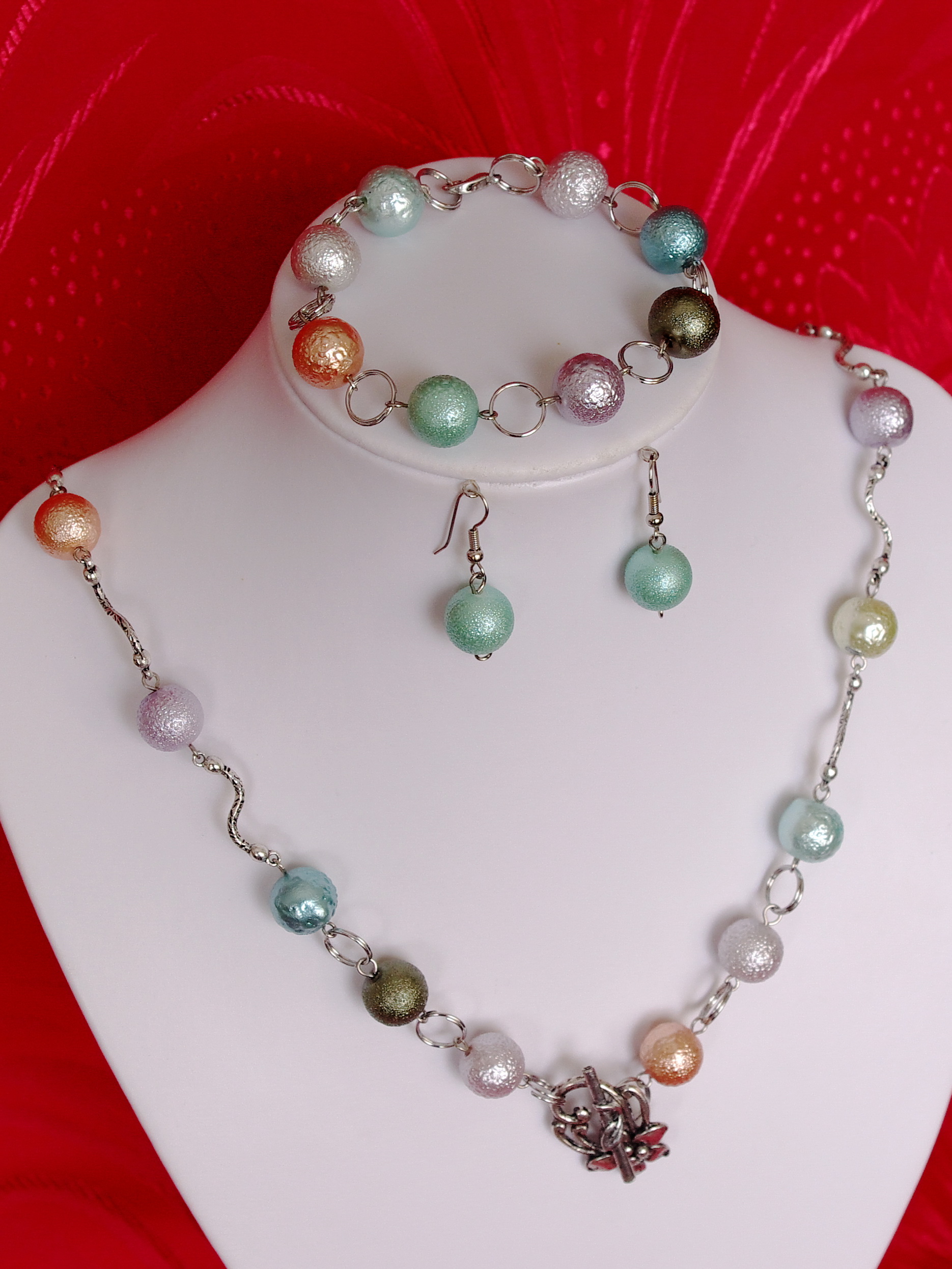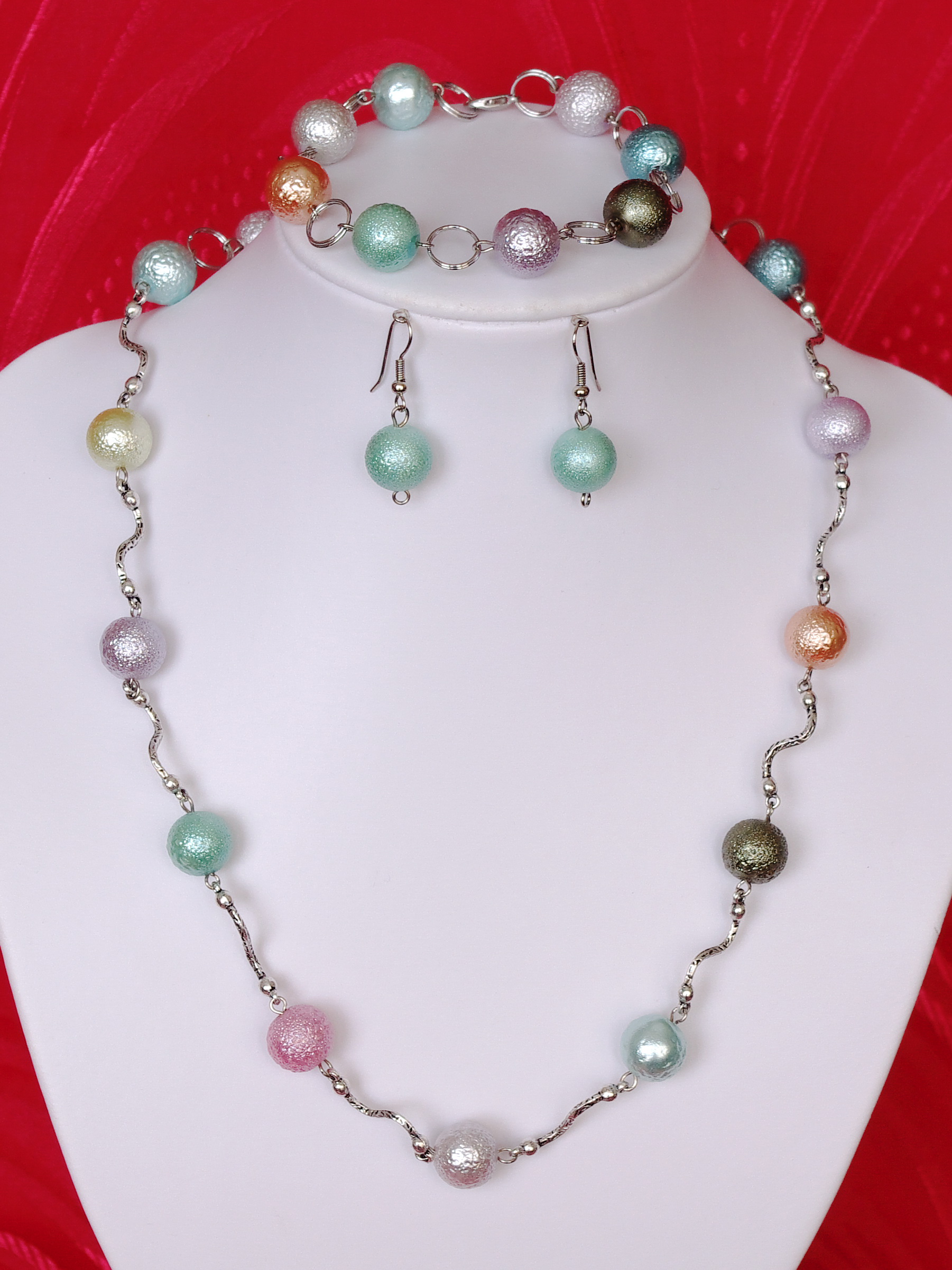 Set bijuterii format din colier,bratara si cercei.Colierul are o lungime de 58 cm si e facut din perle crapy colorate ,link-uri ondulate de culoare argintului vechi , la fel si inchizatoarea , impreuna cu zale duble mari.Bratara are o lungime de 22 cm si poate fi scurtata datorita zalelor din componenta.