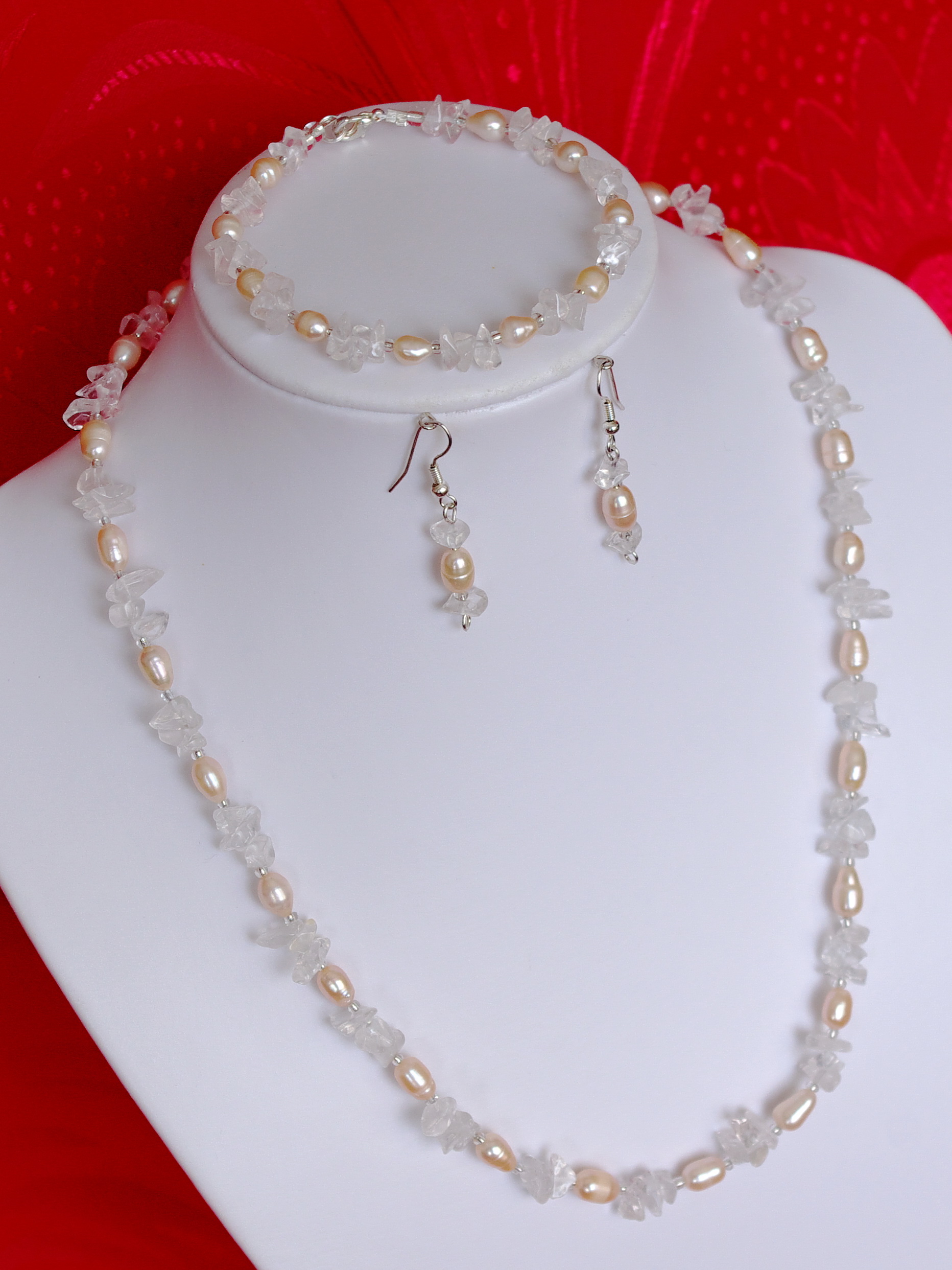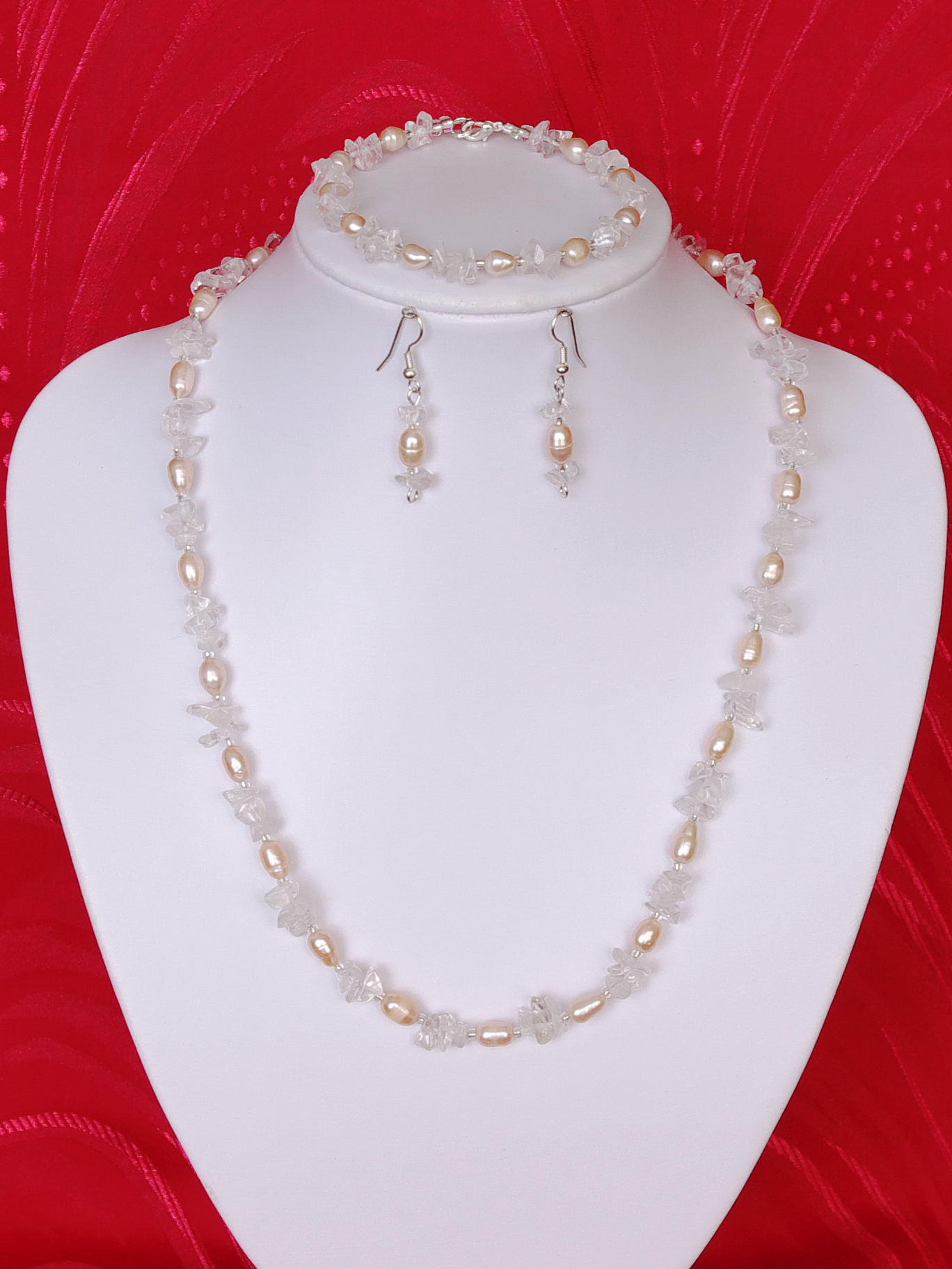 Un set unicat finut si delicat facut din cristal de stanca (cipsuri) , perle naturale de cultura ovale de culoarea somonului,si margele de nisip de 2mm.Combinatia dintre perle si cristal ( gheata eternitatii – vezi art.de la categoria pietre semipretioase ), dau setului un aspect deosebit si delicat.Colierul are o lungime de 55 cm,bratara are 20 cm,iar cerceii au 4 cm inclusiv tortitele.Accesoriile sunt argintii .