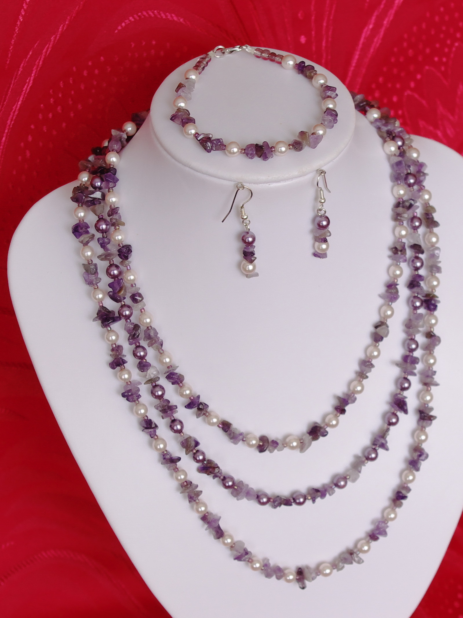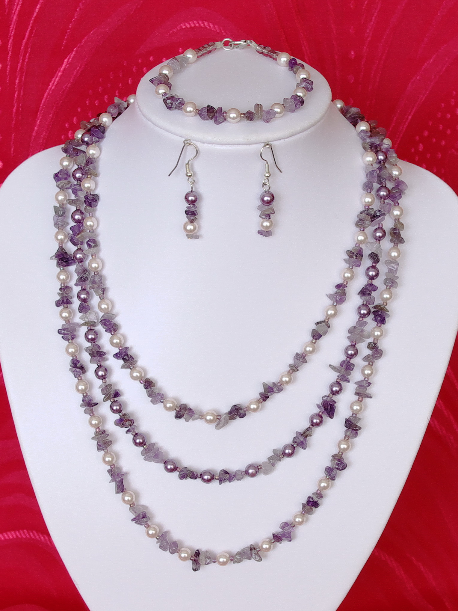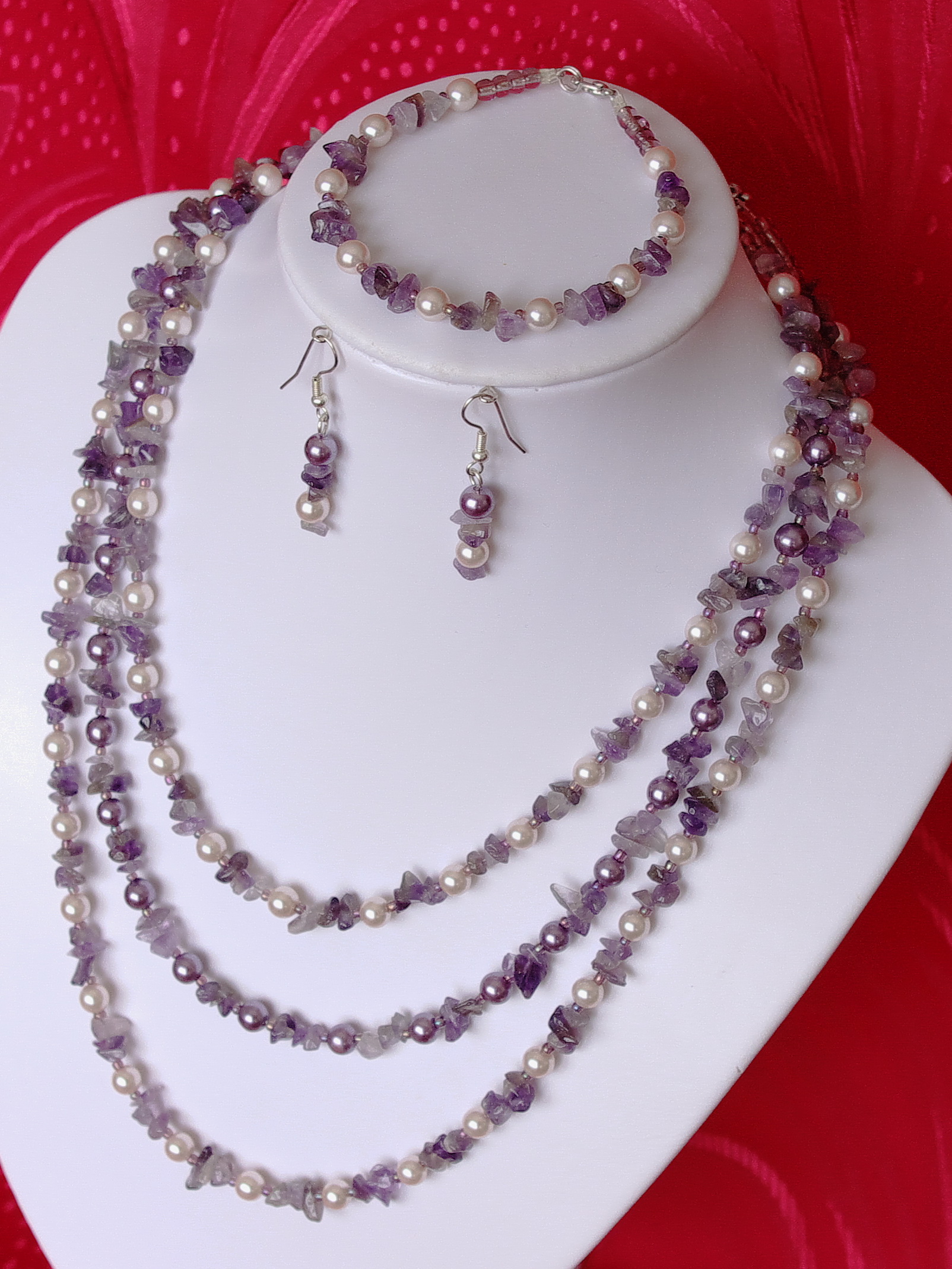 Setul are in componenta lui cipsuri de ametist ,perle de sticla de 6 mm asortate ca si culoare , margele de nisip de 2 si 4 mm ,accesorii metalice ,toate insirate pe fir de silk.