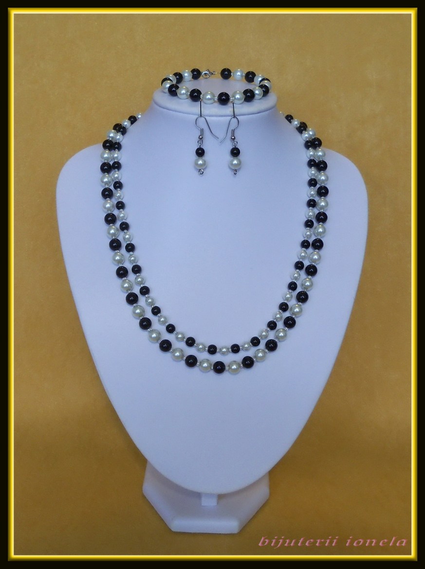 Set format din colier, bratara si cercei.Un set elegant si misterios. Colierul este pe doua randuri format din perle de sticla albe si negre de 6 si 8 mm pe accesorii gun metal.