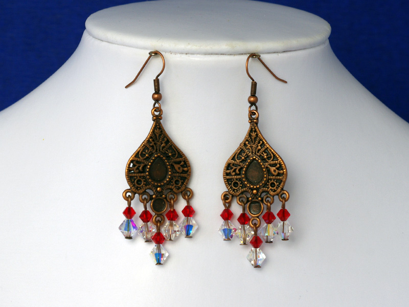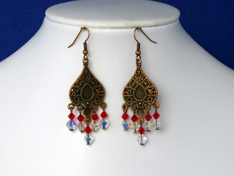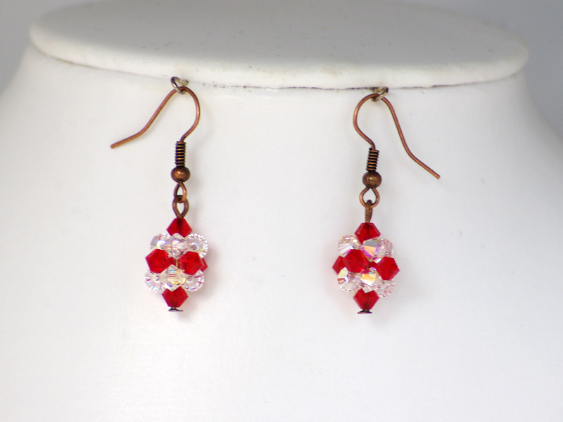 Cercei lungi de aprox.7 cm din cristale biconice Swarovski albe cu reflexe AB de 6mm si cristale biconice rosii de 4mm cu taietura xilion- “The best of brilliance!” ( nota : Taietura” xilion” este brevetata si inregistrata sub marca “CRYSTALLIZED TM – SWAROVSKI ELEMENTS” ,dau cristalelor cel mai inalt nivel de stralucire si intensitate a culorii si astfel, cristalele au stralucire de diamante! ) .Accesoriile metalice sunt de culoarea cuprului.