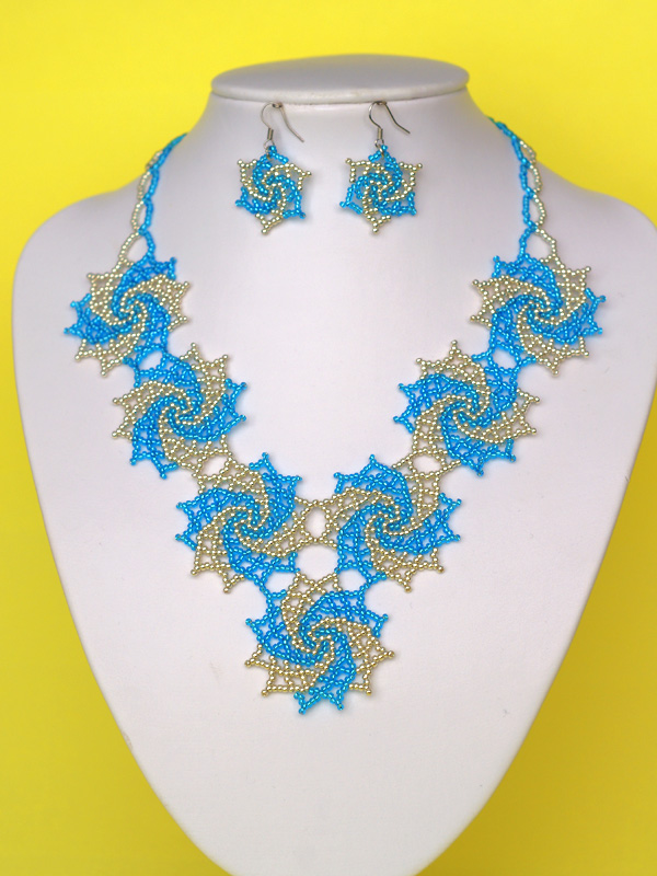 Din margele toho 11/0 albastre cu miez argintiu si toho culoarea untului (metalizate ) , alaturi de un model deosebit ,insirate pe fir de teflon ultra strong, am realizat un colier si cercei la care se poate adauga si bratara la cerere.