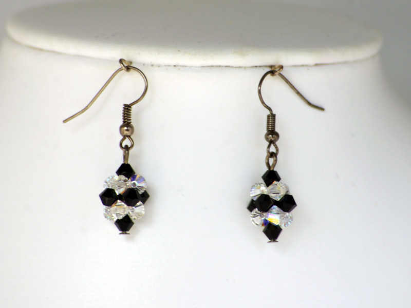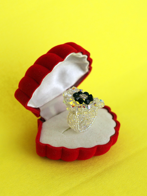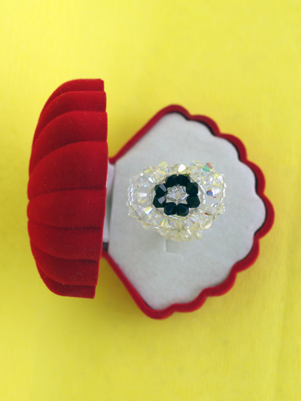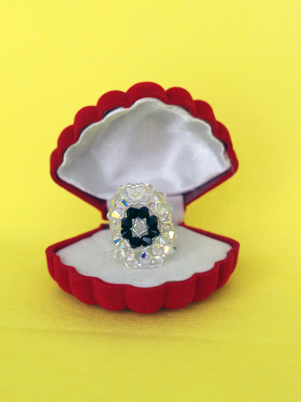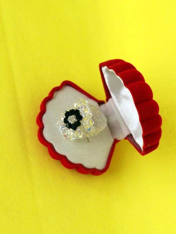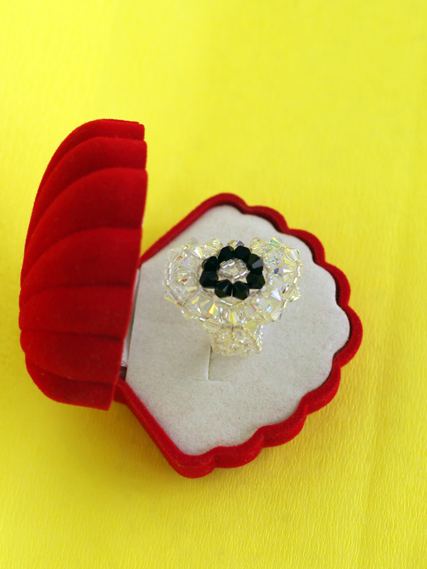 Un inel elegant cu un model interesant facut din cristale biconice Swarovski de 4mm cu taietura xilion- “The best of brilliance!” ( nota : Taietura” xilion” este brevetata si inregistrata sub marca “CRYSTALLIZED TM – SWAROVSKI ELEMENTS” ,dau cristalelor cel mai inalt nivel de stralucire si intensitate a culorii si astfel, cristalele au stralucire de diamante! ). , in doua combinatii de culori : negru si alb cu reflexe AB ,margele Delica 11/0 albe AB si insirate pe fir monofilament special ultra strong.