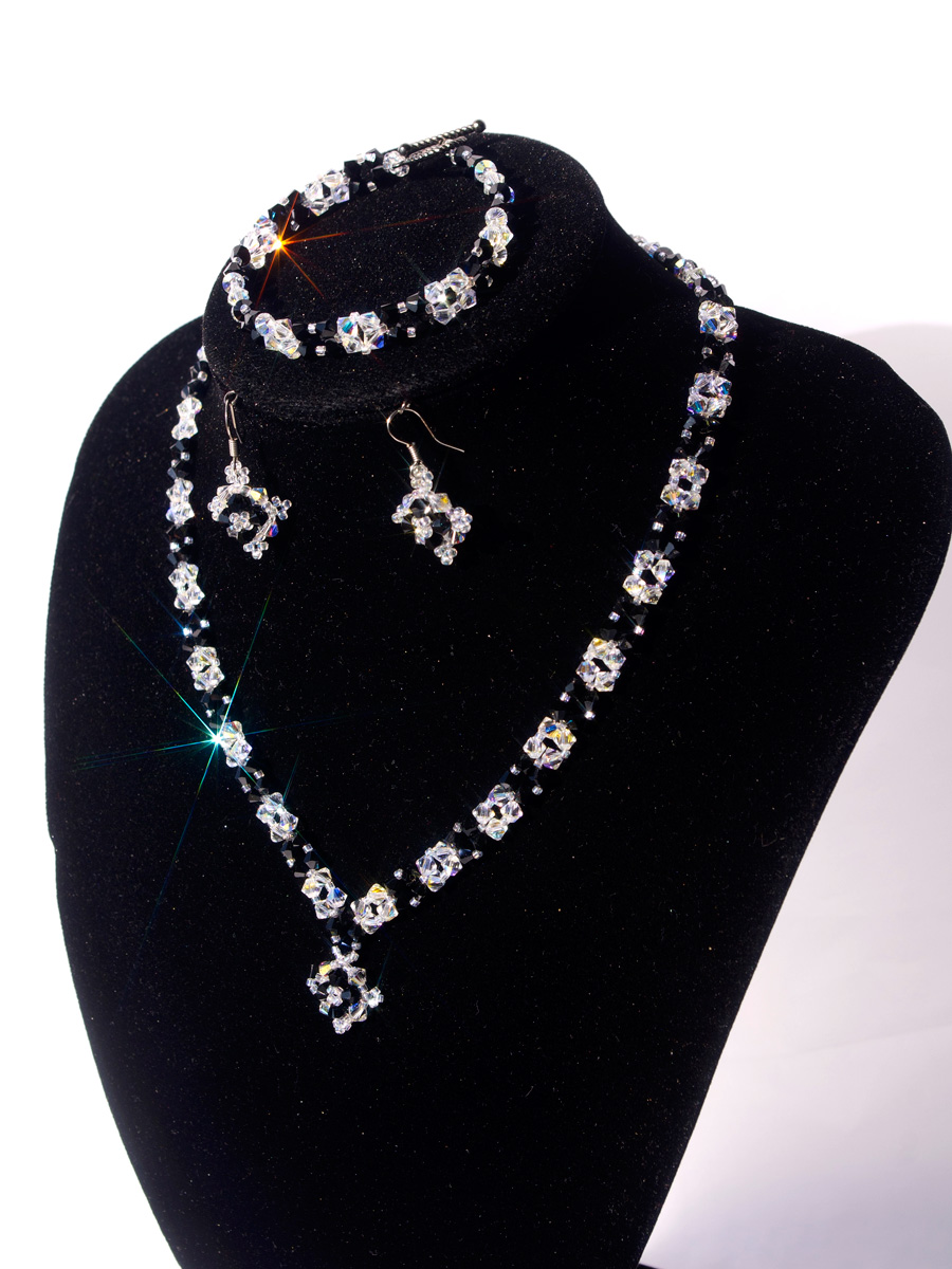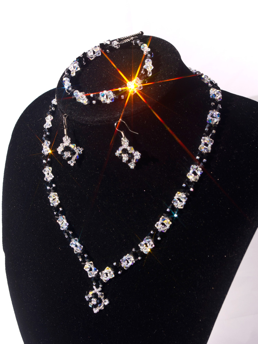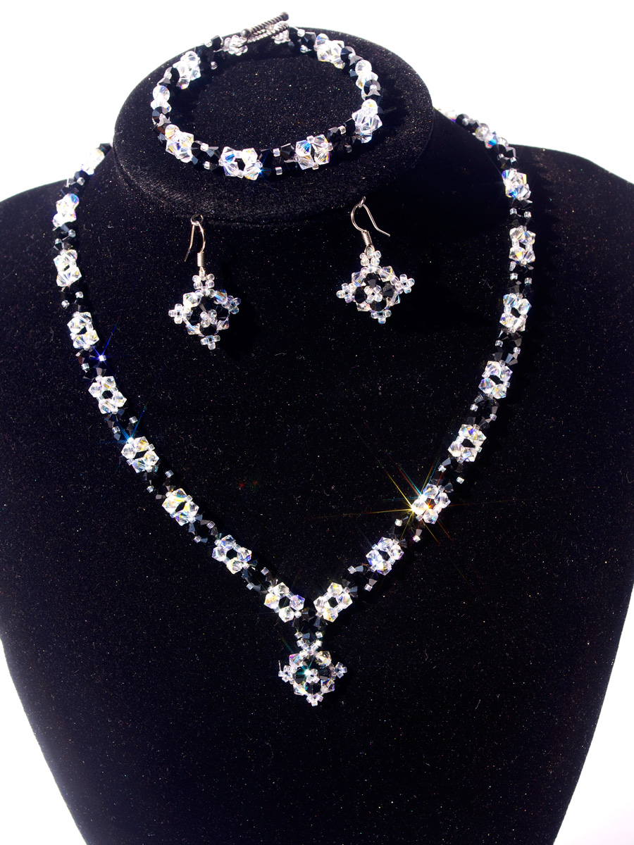 Un set clasic,stralucitor facut din peste 280 cristale biconice Swarovski cu taietura xilion- “The best of brilliance!” ( nota : Taietura” xilion” este brevetata si inregistrata sub marca “CRYSTALLIZED TM – SWAROVSKI ELEMENTS” ,dau cristalelor cel mai inalt nivel de stralucire si intensitate a culorii si astfel, cristalele au stralucire de diamante! )Am folosit cristale biconice negre de 4 mm ,impletite cu cristale albe cu reflexe AB de 4 mm, ajustate cu margele toho 11/0 albe AB ,insirate pe fir special monofilament de teflon ultra stong.Colierul este in V, la baza gatului ,avind inchizatoare lucrata manual din margele toho.Bratara are aprox.18-19 cm si are inchizatoare din argint tibetan.Cerceii ,au tortitele din otel chirurgical si sunt placate cu argint.Setul se poate achizitiona complet sau pe componente.
