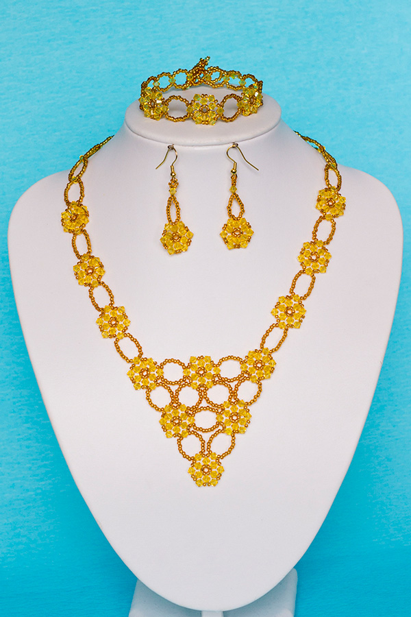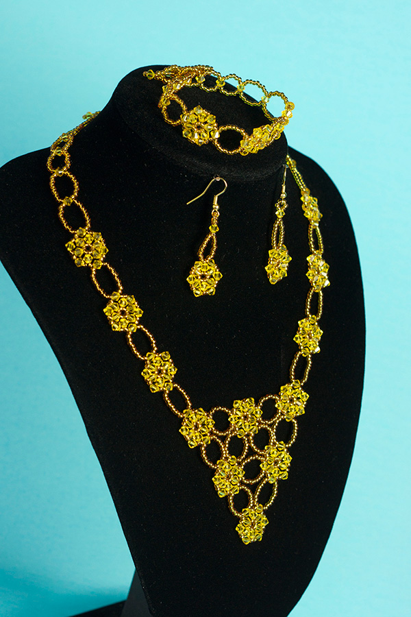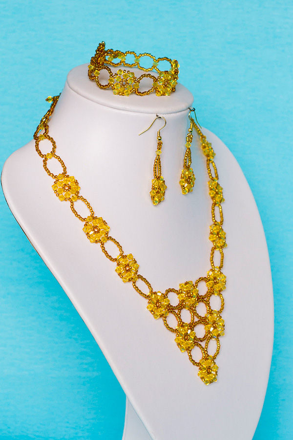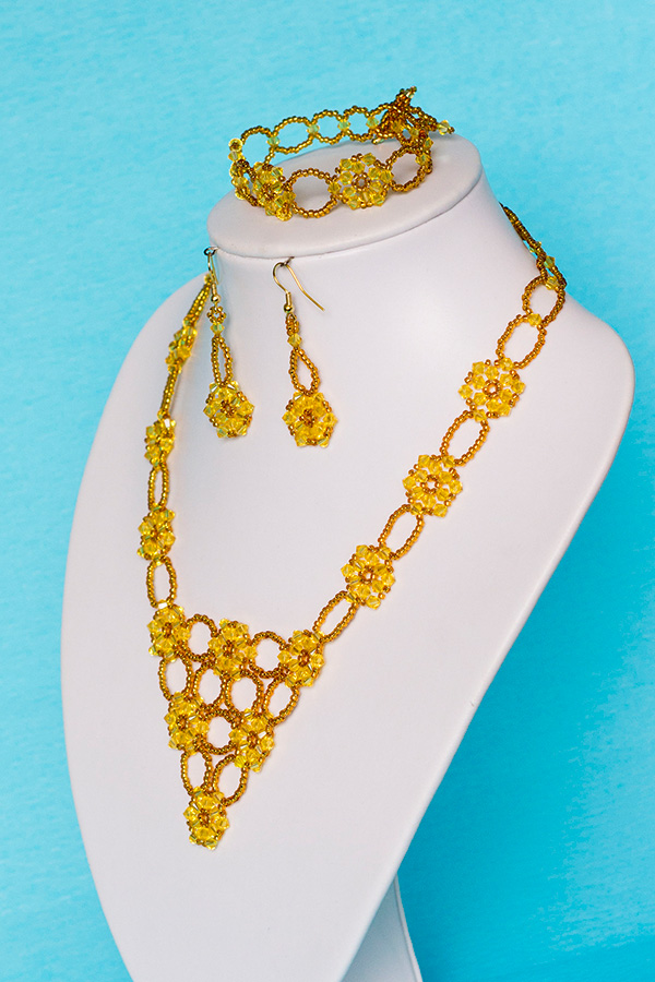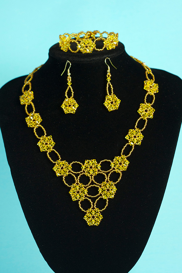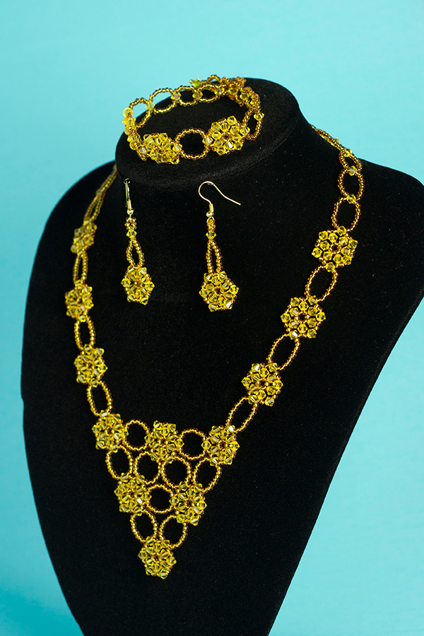Hello!! Am revenit cu un nou set de bijuterii din cristale Swarovski de 4mm cu taietura xilion „the best of brilliance”.Culoarea puternica a cristalelor impreuna cu margele toho aurii cu interior argintiu dau colierului multa stralucire si eleganta in acelasi timp.Singurele accesorii metalice din acest set sunt tortitele cerceilor, acestia au o lungime de 5cm,iar bratara are 20 -21 cm dar se poate scurta datorita modelului.In componenta setului se regasesc aprox.230 de cristale.