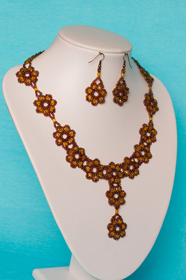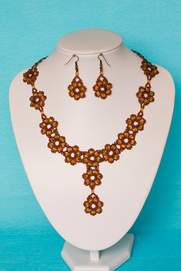 Sute de margele toho maro cu reflexe AB , alaturi de cristale fatetate ” PRECIOSA” (Cehia) ,insirate pe fir monofilament teflonat ,intr-un model deosebit ,amestecate cu multa dragoste pentru frumos ,sunt rezultatul de mai sus .