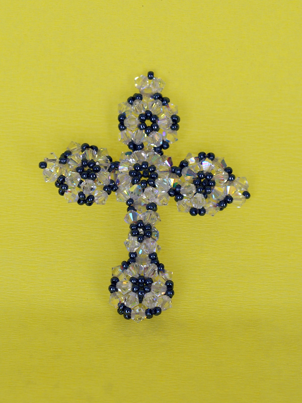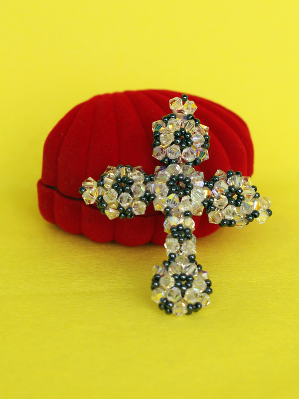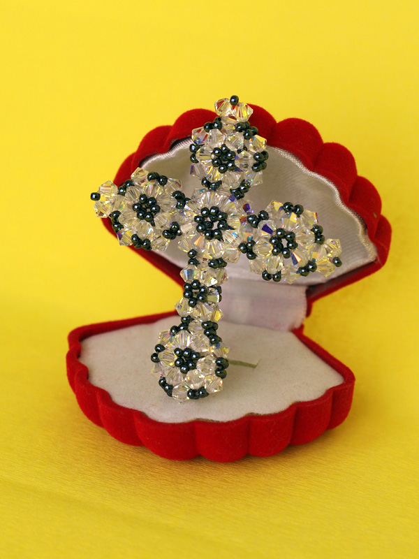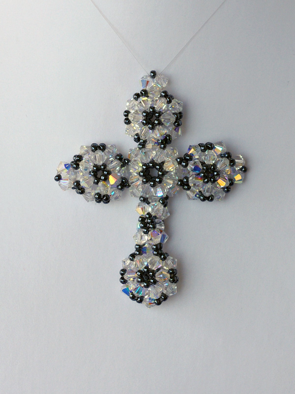 O cruce – pandativ de aprox. de 6,5 cm lungime si 5,5 cm latime facut din cristale biconice Swarovski de 4mm cu taietura xilion- “The best of brilliance!” ce da cristalelor cel mai inalt nivel de stralucire si intensitate a culorii ,astfel, cristalele au stralucire de diamante! , cristale alb transparent cu reflexii AB in numar de peste 100 buc.Se poate purta pe silk sau pe un lantisor subtire.La cerere se poate face un lant asortat din toho si cristale.