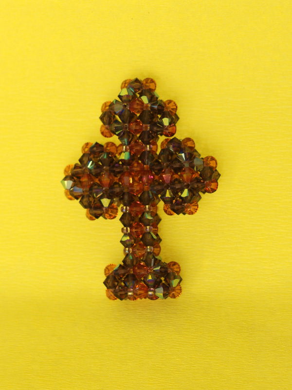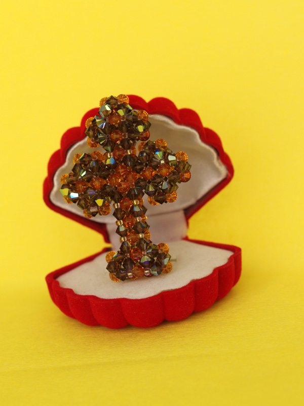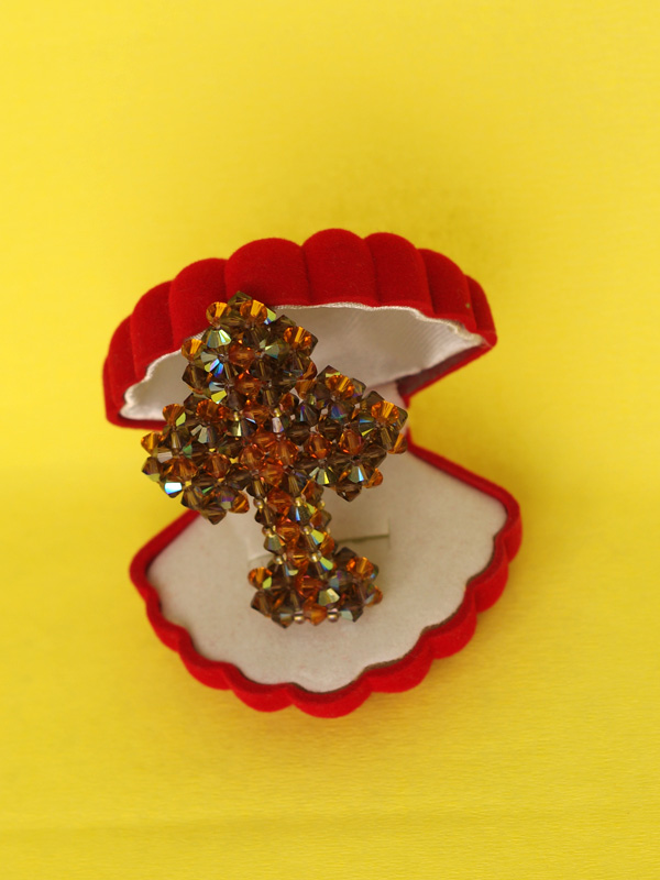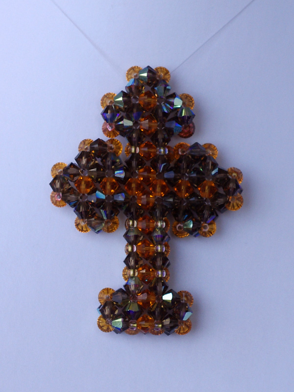 Din 180 cristale biconice Swarovski de 4mm cu taietura xilion- “The best of brilliance!”( ce da cristalelor cel mai inalt nivel de stralucire si intensitate a culorii ,astfel, cristalele au stralucire de diamante! ). Cristale biconice de culoarea cuartului fumuriu cu reflexe AB ,in combinatie cu o nuanta de auriu spre cupru reflexe AB, este facuta cruciulita din imaginile de mai sus .Are o lungime de 5,5 cm si o latime de 4 cm , poate fi purtata pe un lantisor , pe un snur de piele ,pe o bentita de catifea sau la cerere se poate face un colier din swarovski.Datorita modelului 3D se poate folosi si ca un obiect de decor.