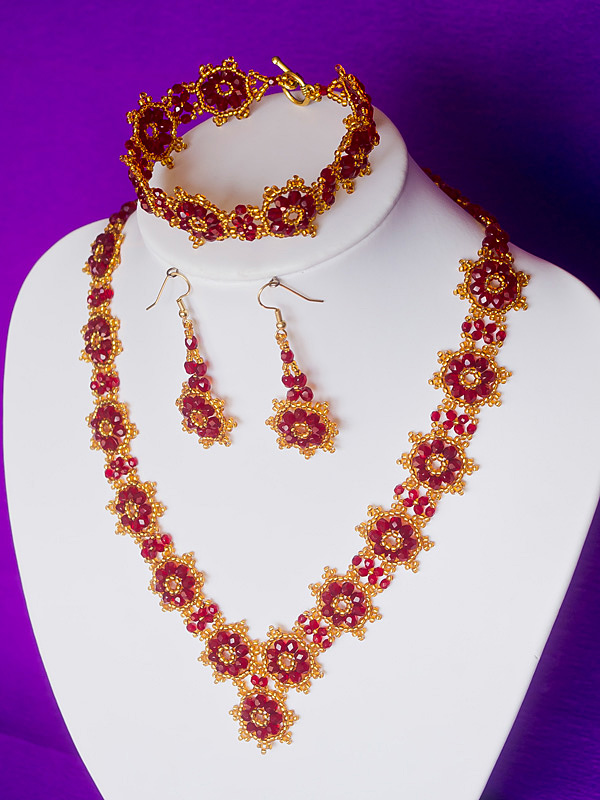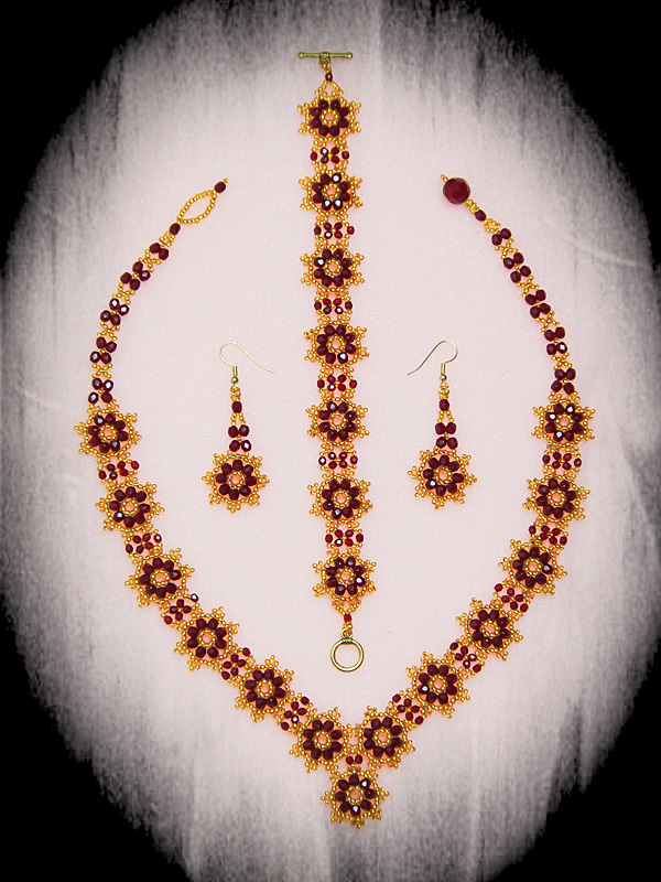 Un set de bijuterii foarte elegant ce are in componenta sute de margele toho 11/0 de curoare aurie cu interior argintiu si fire polished beads preciosa de 4mm ruby siam (modelul cat si combinatia celor doua culori te poate duce cu gandul la un bal de epoca cu printi si printese), si bineinteles nelipsitul fir monofilament teflonat ultrastrong.Inchizatoarea colierului este facuta din margele toho si un cristal in 32 fatete de 12mm, iar inchizatoarea bratarii este argint tibetan placat cu aur antichizat.Tortitele cerceilor sunt din otel chirurgical placat cu aur.