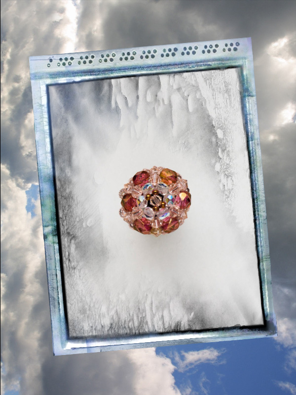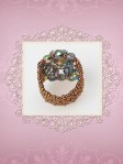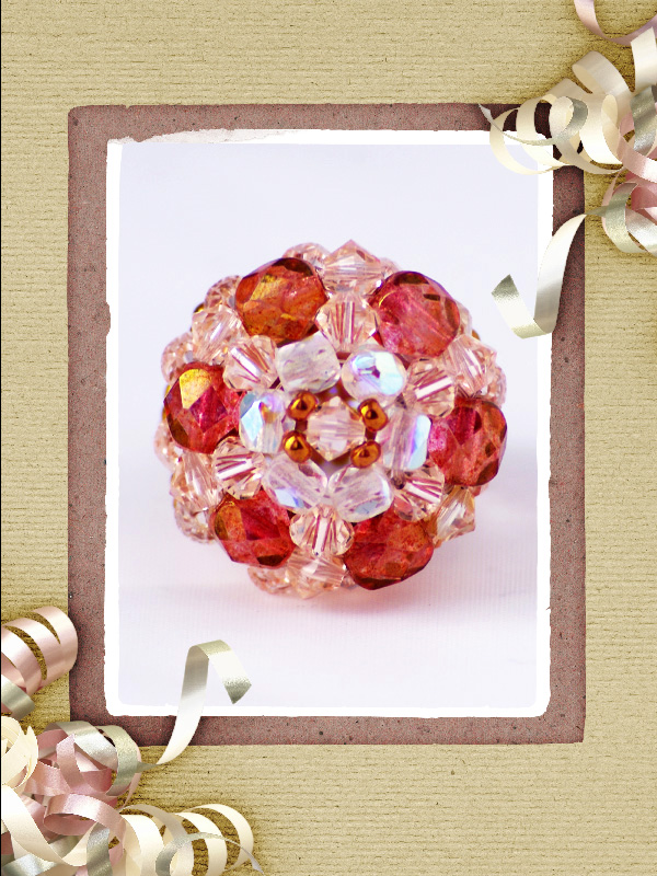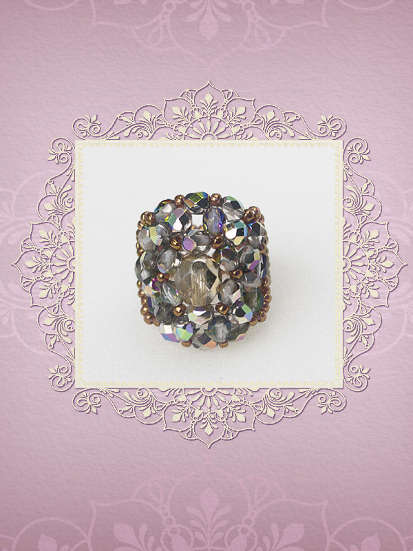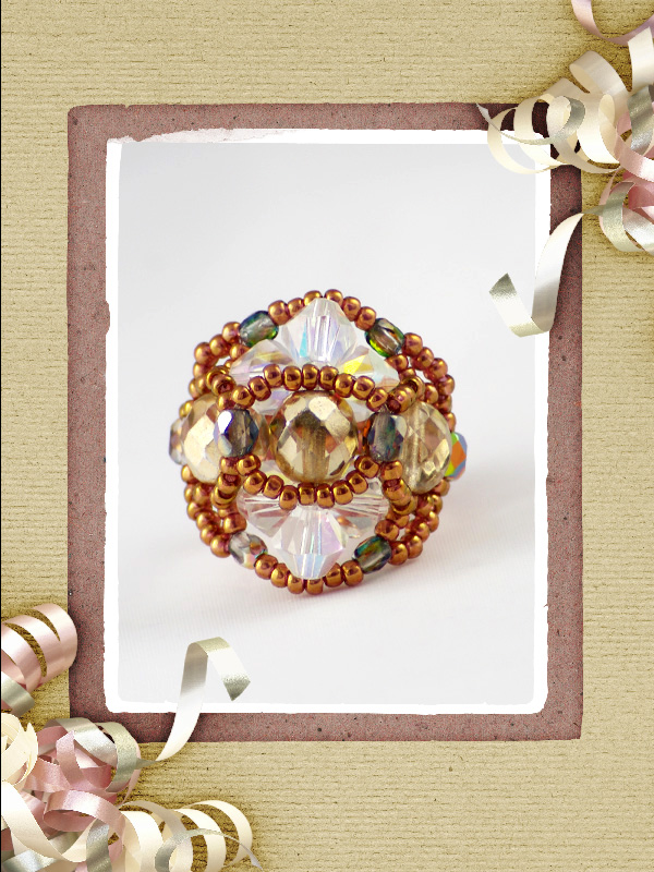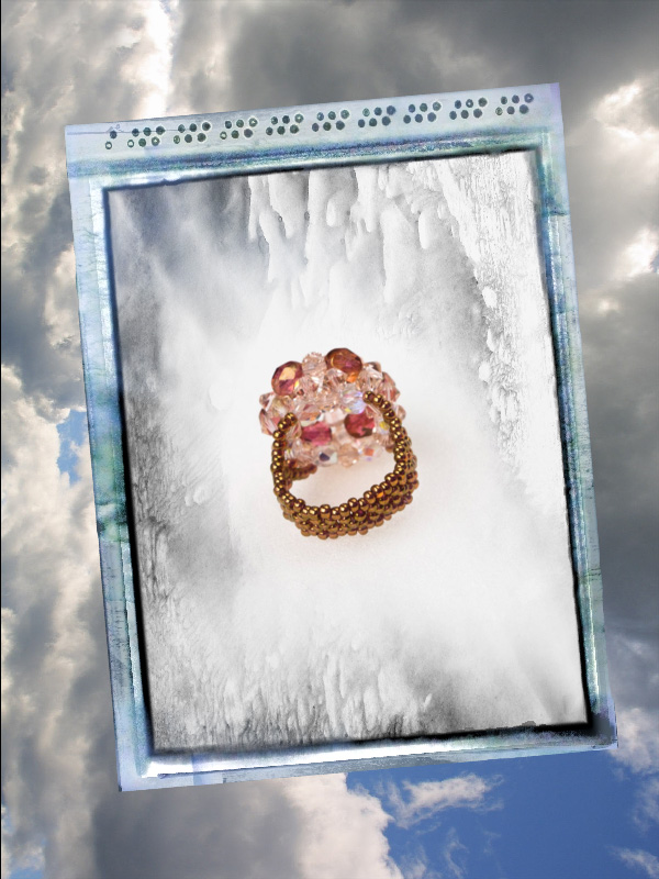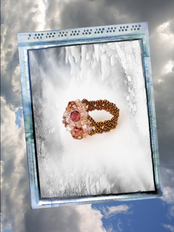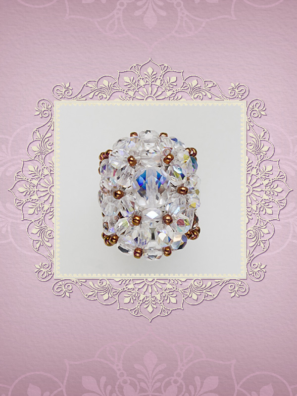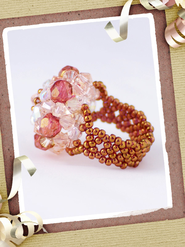 Un inel ce face parte din categoria ” preferate de top”.Cu un model „imperial” ce-l deosebeste de celelalte inele acesta este creat din cristale biconice Swarovski cu taietura xilion- “The best of brilliance!” culoarea piersicii de 4 mm – 31 buc ,impletite cu fire polished culoarea alba cu reflexe AB de 4mm -12 buc , fire polished beads roze de 6mm- 6buc, ajustate cu margele toho 11/0 cupru – auriu,insirate pe fir special monofilament de teflon ultra strong .Marime inel – 8, dar se poate modifica.