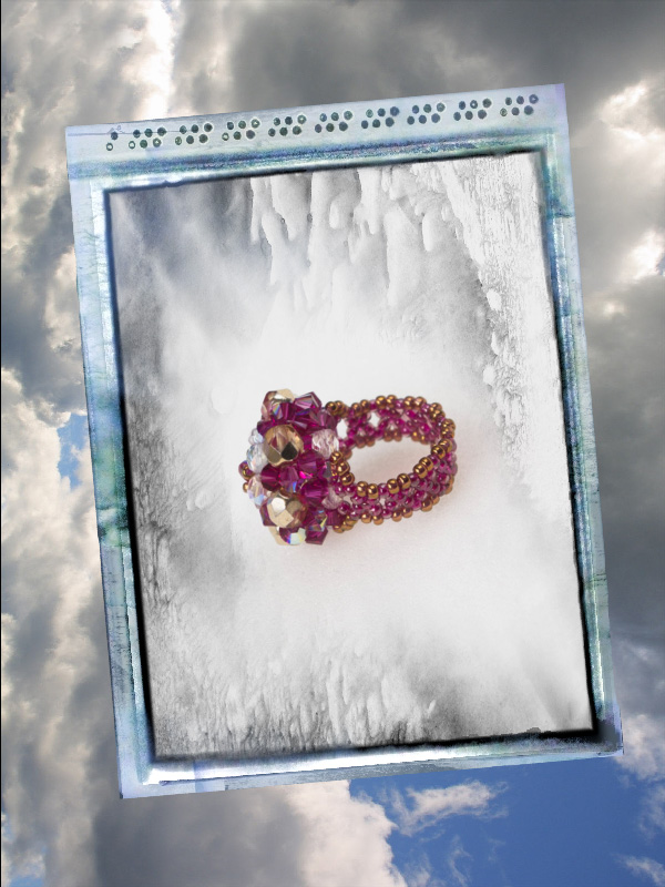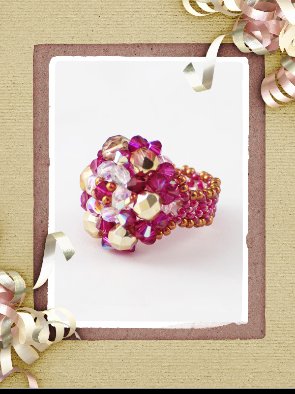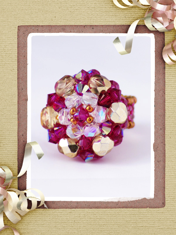 Un alt inel ce face parte din categoria ” preferate de top”. Cu acelasi model “imperial” ce este creat din cristale biconice Swarovski cu taietura xilion- “The best of brilliance!” culoare fucsia intens de 4 mm – 31 buc, impletite cu fire polished culoarea alba cu reflexe AB de 4mm -12 buc , fire polished beads aurii de 6mm- 6buc, ajustate cu margele toho 11/0 cupru – auriu si fucsia, insirate pe fir special monofilament de teflon ultra strong . Marime inel – 8, dar se poate modifica.