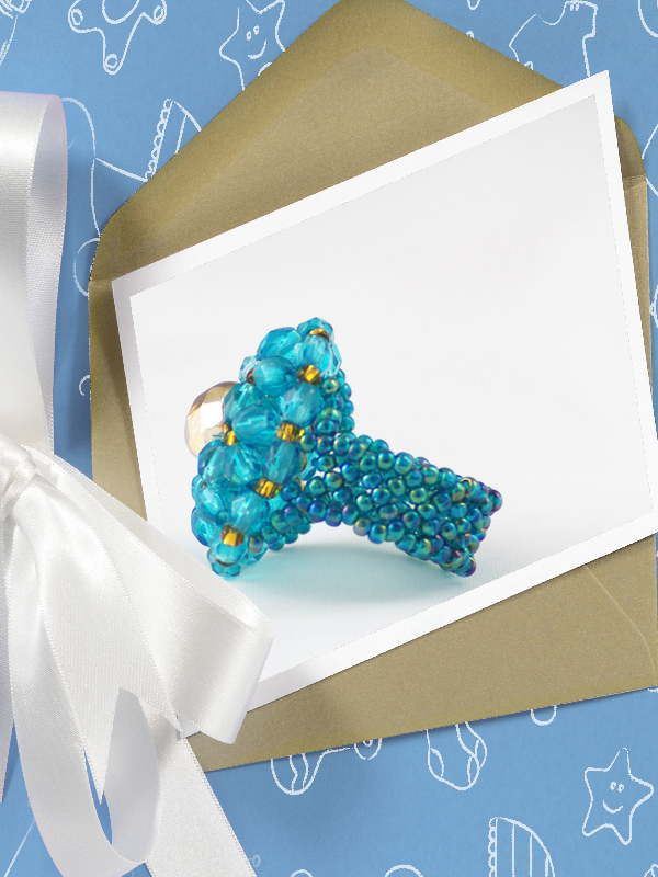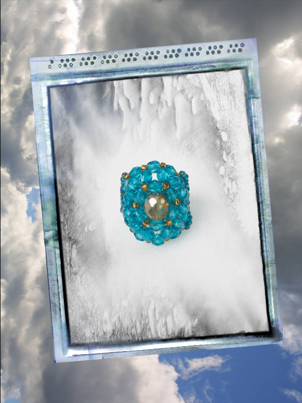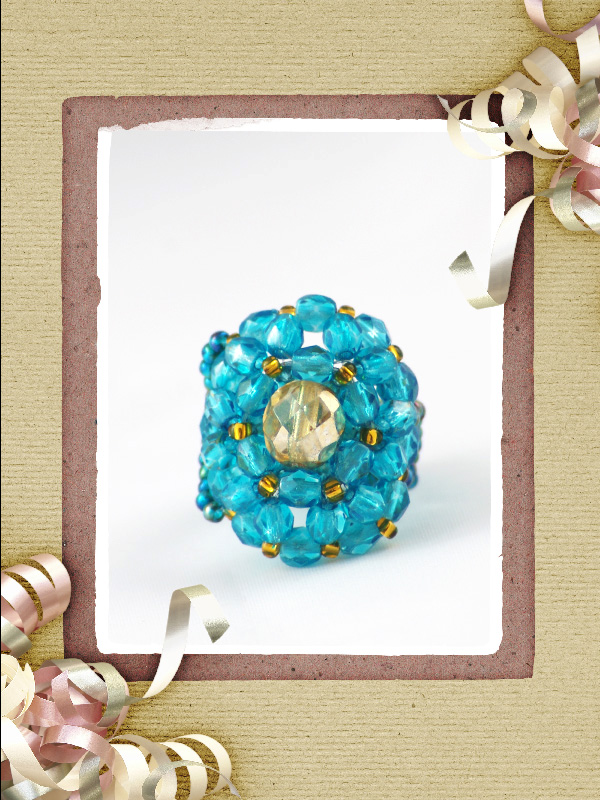 Incepe o serie de inele care au acelasi model, dar in mai multe combinatii de culori.Pentru inceput este in prim plan cel de culoare albastru turcoaz si auriu.Confectionat din fire polished beads de 4 mm- 36 buc, ce au in centru una de 8mm aurie, margele toho 11/0 in culori ce se asorteaza, pe fir de nylon teflonat.Marime inel – 8 – 8,5.