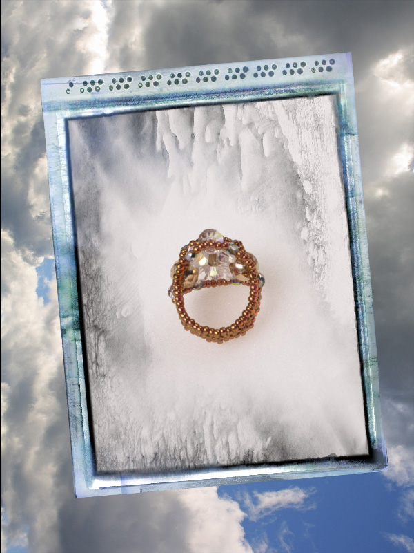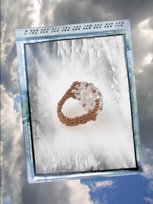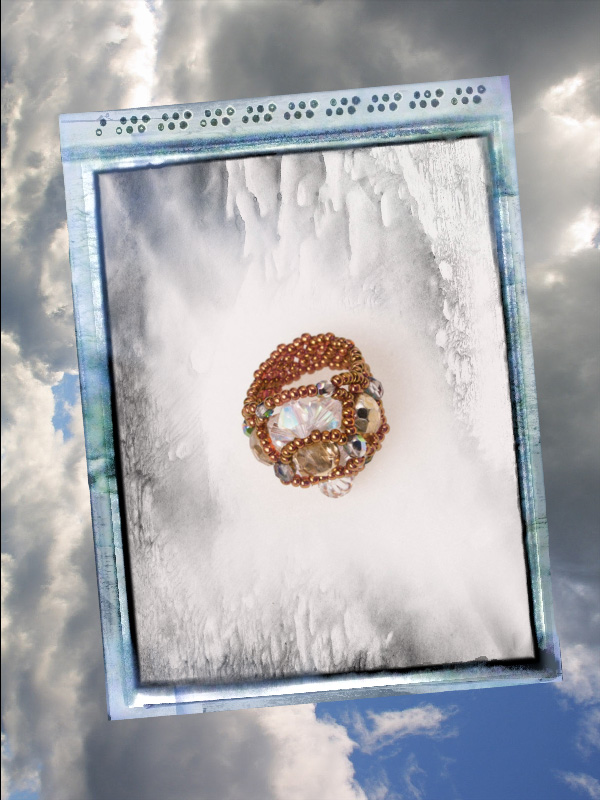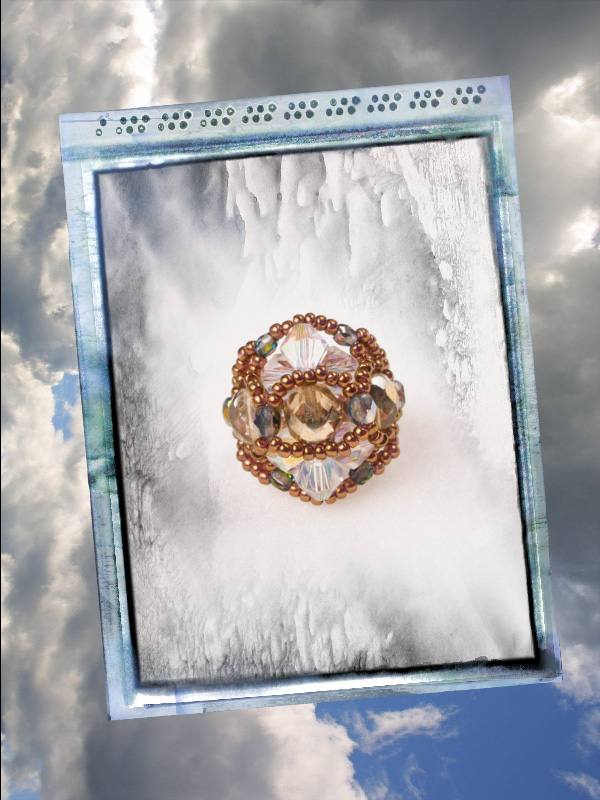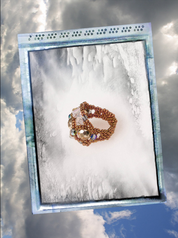Un model deosebit, mare, ce iese in evidenta. Facut manual din margele toho 11/0, o culoare deosebita cupru -auriu, cristale biconice fatetate albe cu reflexe AB,fire polished beads de 8 mm, aurii si fire polished de 3 si de 4mm culoarea vitraliu, si ca de fiecare data am folosit fir monofilament ultra strong teflonat de 0,2 .Marime inel 8,5 dar se poate face si in alte marimi.