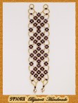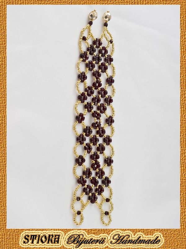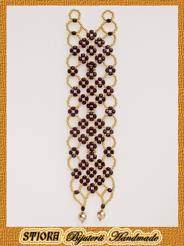 Are o lungime de aprox. 19 cm si o latime de 4,5 cm si este lucrata cu toho 11/0 rotund culoare Permanent Finish – Galvanized Gold de 2mm si fire polished beads de 4 mm de culoarea granatului, insirate pe fir de nylon teflonat ultra strong. Pentru o rezistenta in timp (teama de a nu se oxida), i-am facut inchizatoare din toho si fire polished de 6mm.