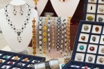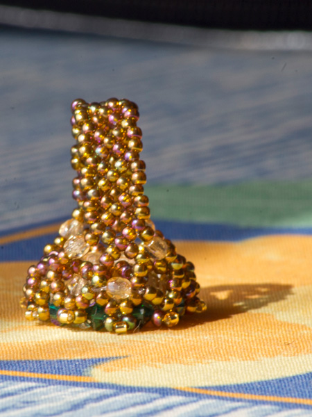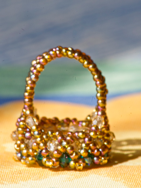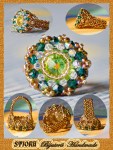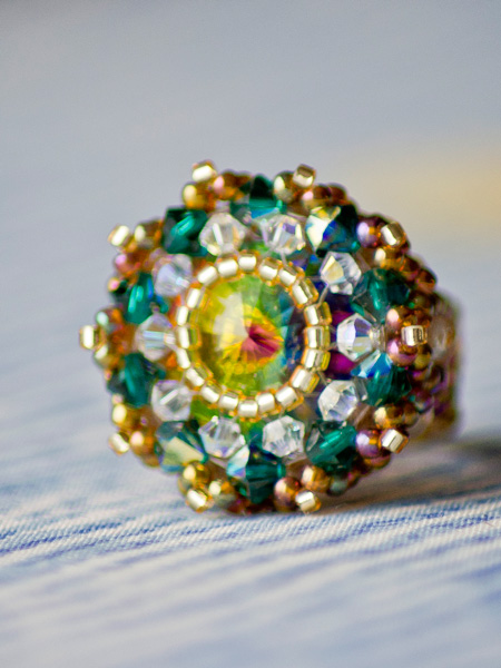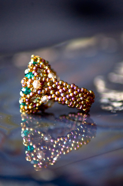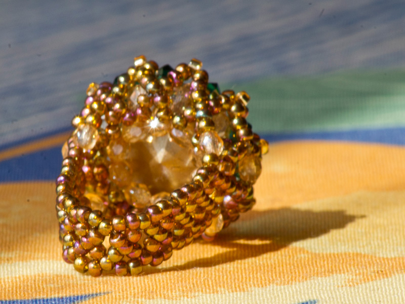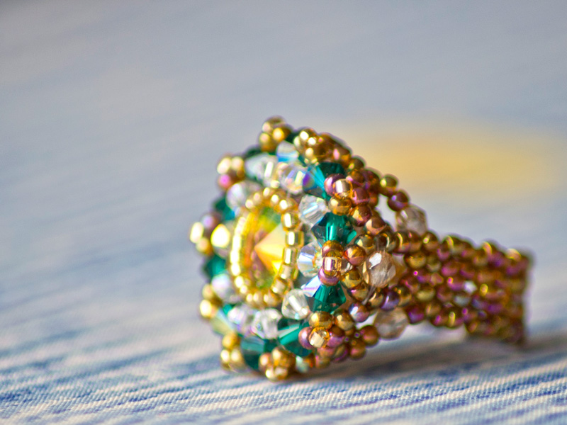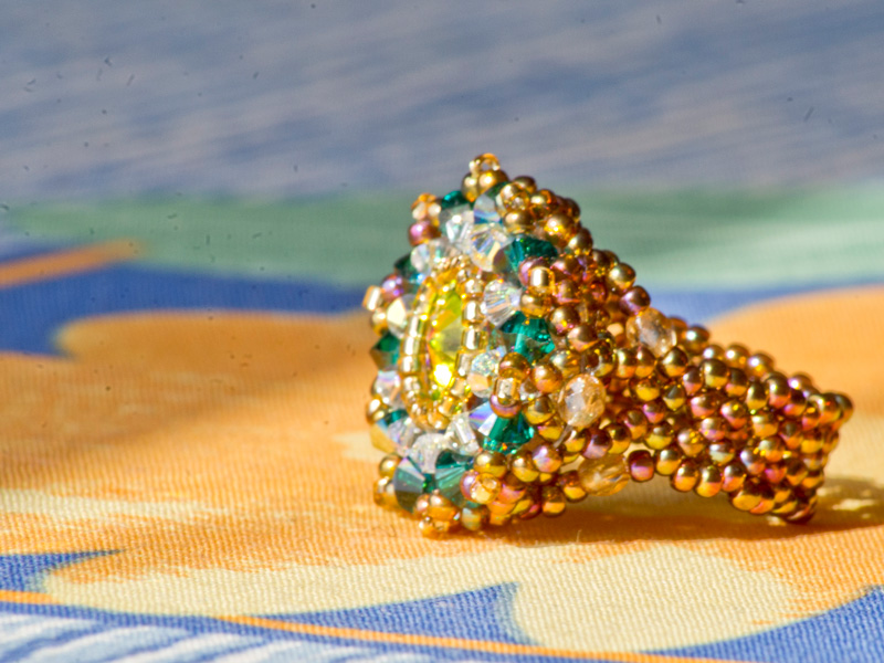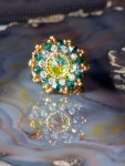 Piesa centrala este un Swarovski –rivoli de 14mm „Sahara”, imbracat cu cristale Sw. biconice albe AB de 3mm si verde smarald de 4mm, fire polished beads de 3 si 4mm, ornat cu margele toho 11/0, cu irizatii interesante in ton cu jocurile de culori din rivoli, combinate cu margele Delica gold, nu in ultimul rand firul monofilament teflonat ultra strong de 0,20 .