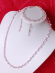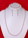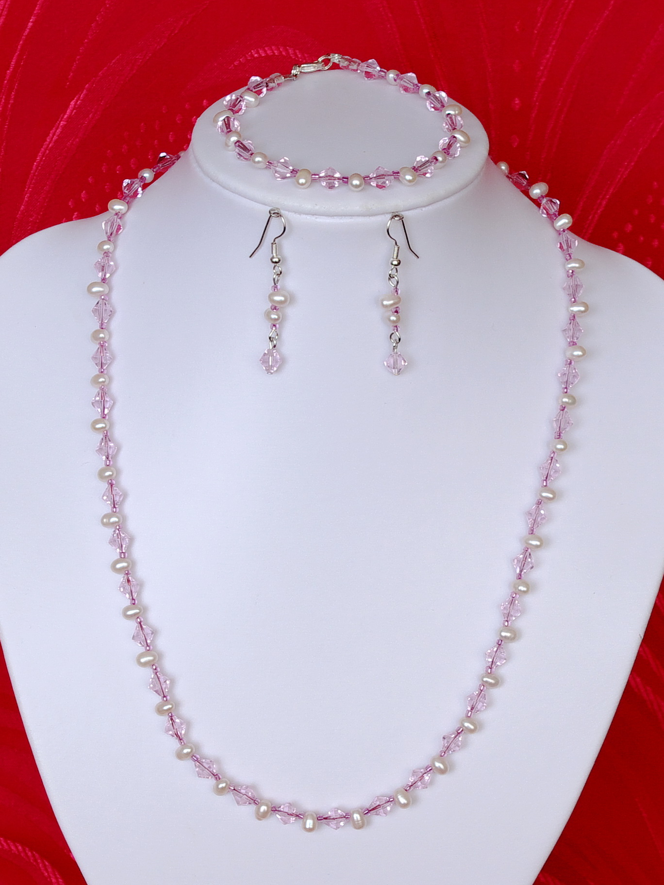 Un set de bijuterii finut si delicat din perle naturale de cultura albe de 4-6 mm si cristale biconice de 6 mm roz deschis , este format din colier – 56 cm ,bratara – 21 cm si cercei – 4,5mm , in model clasic. Accesoriile sunt argintii.