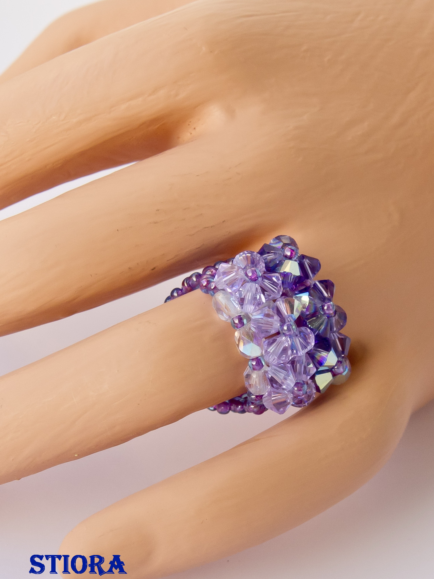 Facut din perle Swarovski de 4mm de culoare gri si cristale biconice Swarovski cu taietura xilion- “The best of brilliance!” ( nota : Taietura” xilion” este brevetata si inregistrata sub marca “CRYSTALLIZED TM – SWAROVSKI ELEMENTS” ), cristale biconice de 4mm gri cu reflexe AB. Tortita inelului e facuta din margele toho de 11/0 de culoare ce se asorteaza perfect, intinse pe fir nylon monofilament teflonat ultra strong. Masura este de 7,5 -8 dar se poate face alta.